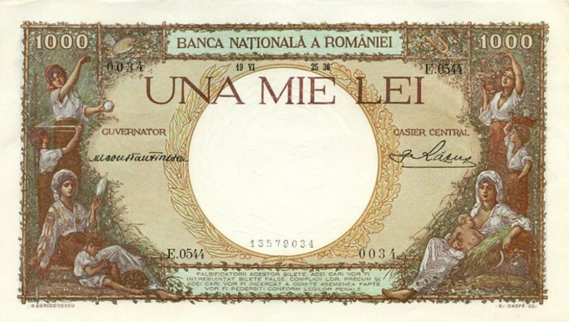 „În urma acordului intervenit între guvern și Banca Națională, în vederea reevaluării stocului de aur, conducerea institutului nostru de emisiune a luat hotărârea de a preschimba biletele actuale de 500 și 1000 de lei. Noile bilete vor avea desenuri din operele marelui nostru pictor Grigorescu. Biletul de 1000 de lei, care va fi mai mic decât cel în circulație azi, va fi de culoare albastră, ca și cele de 500 de lei”.