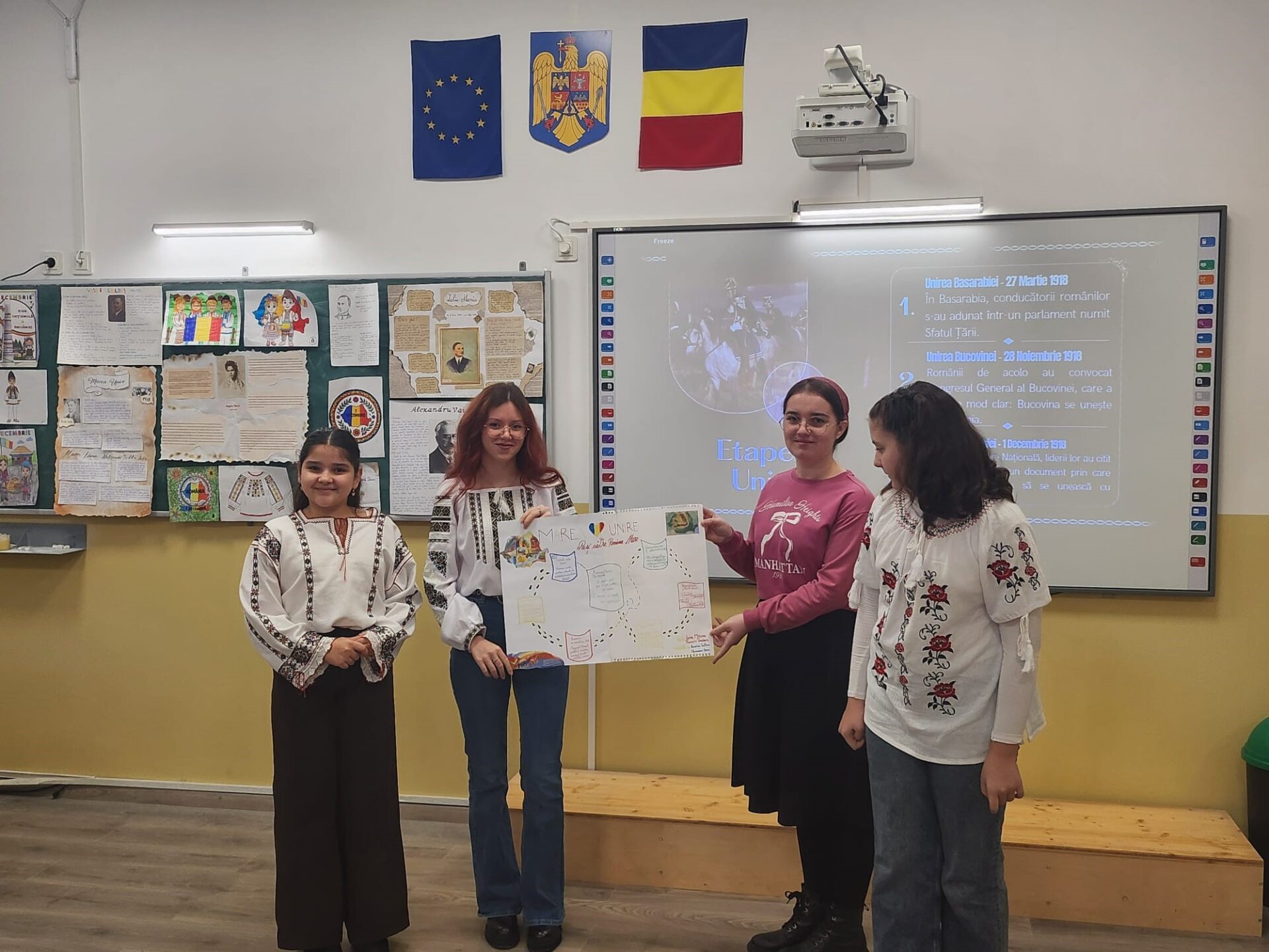 Elevii claselor a XII-a B, a IX-a C și a V-a C au realizat planșe tematice despre: etapele Unirii, personalitățile Marii Uniri, simboluri naționale, harta României Mari, idei-cheie despre identitate și unitate.