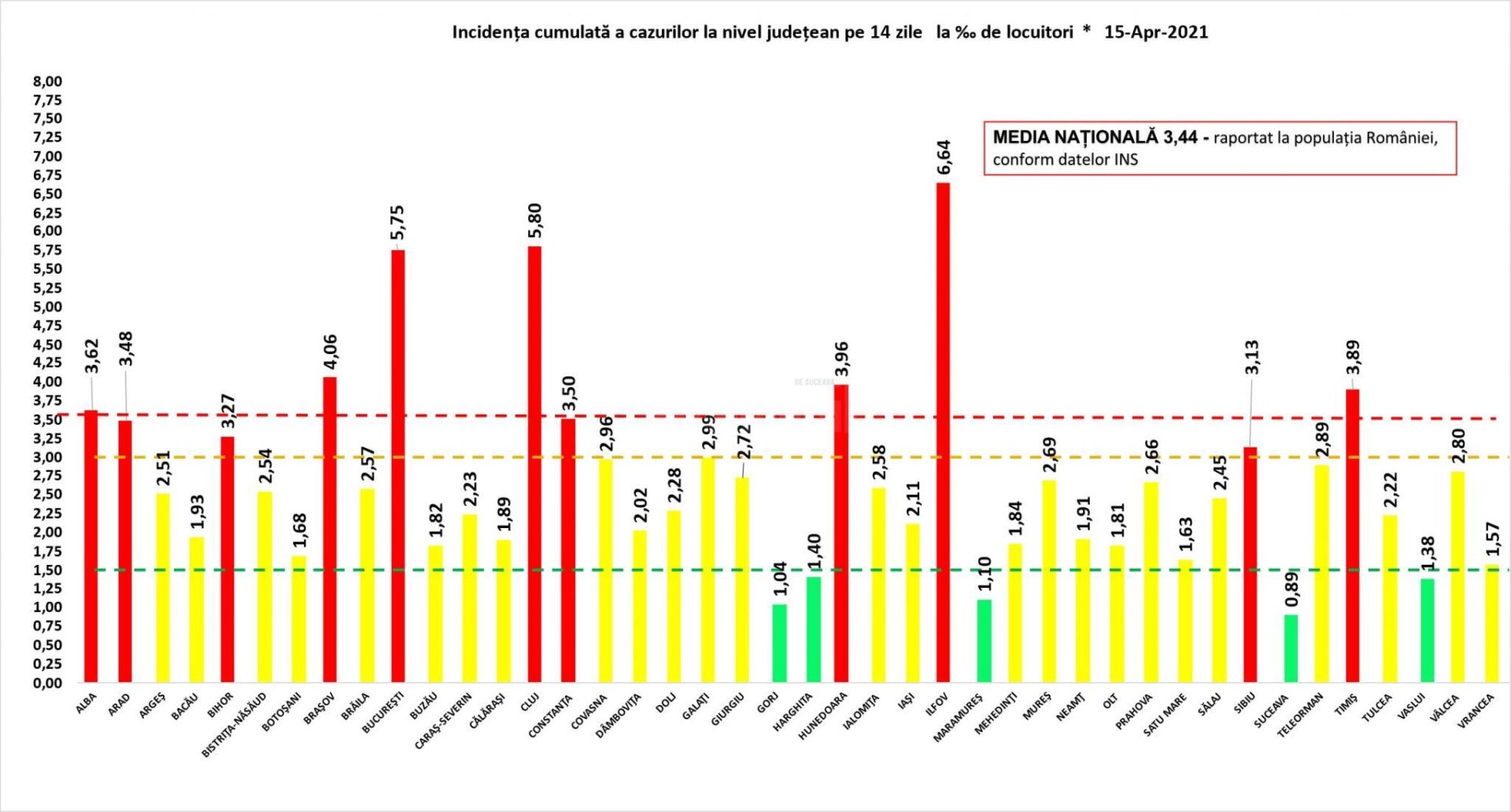 În țară, în ultimele 24 de ore au fost efectuate 26.132 de teste RT-PCR (16.640 în baza definiției de caz și a protocolului medical și 9.492 la cerere) și 11.385 de teste rapide antigenice. În urma acestora au fost înregistrate 3.852 de cazuri noi de persoane infectate cu SARS – CoV –2. Mai mult de 100 de cazuri pe zi au 14 județe, iar cel mai mare număr de cazuri noi s-a înregistrat joi în București – 889, Cluj – 274, Prahova – 173, Iași – 168 și Timiș – 166. Joi a fost raportat un număr mare de decese în rândul pacienților infectați cu coronavirus: 195 de decese (109 bărbați și 86 femei), dintre care 183 ale unor pacienți cu comorbidități. Un deces a fost înregistrat la categoria de vârstă 30-39 ani, 10 decese s-a înregistrat la categoria de vârstă 40-49 ani, 21 de decese la categoria de vârstă 50-59 ani, 44 de decese la categoria de vârstă 60-69 ani, 70 de decese la categoria de vârstă 70-79 ani și 49 de decese la categoria de peste 80 de ani.