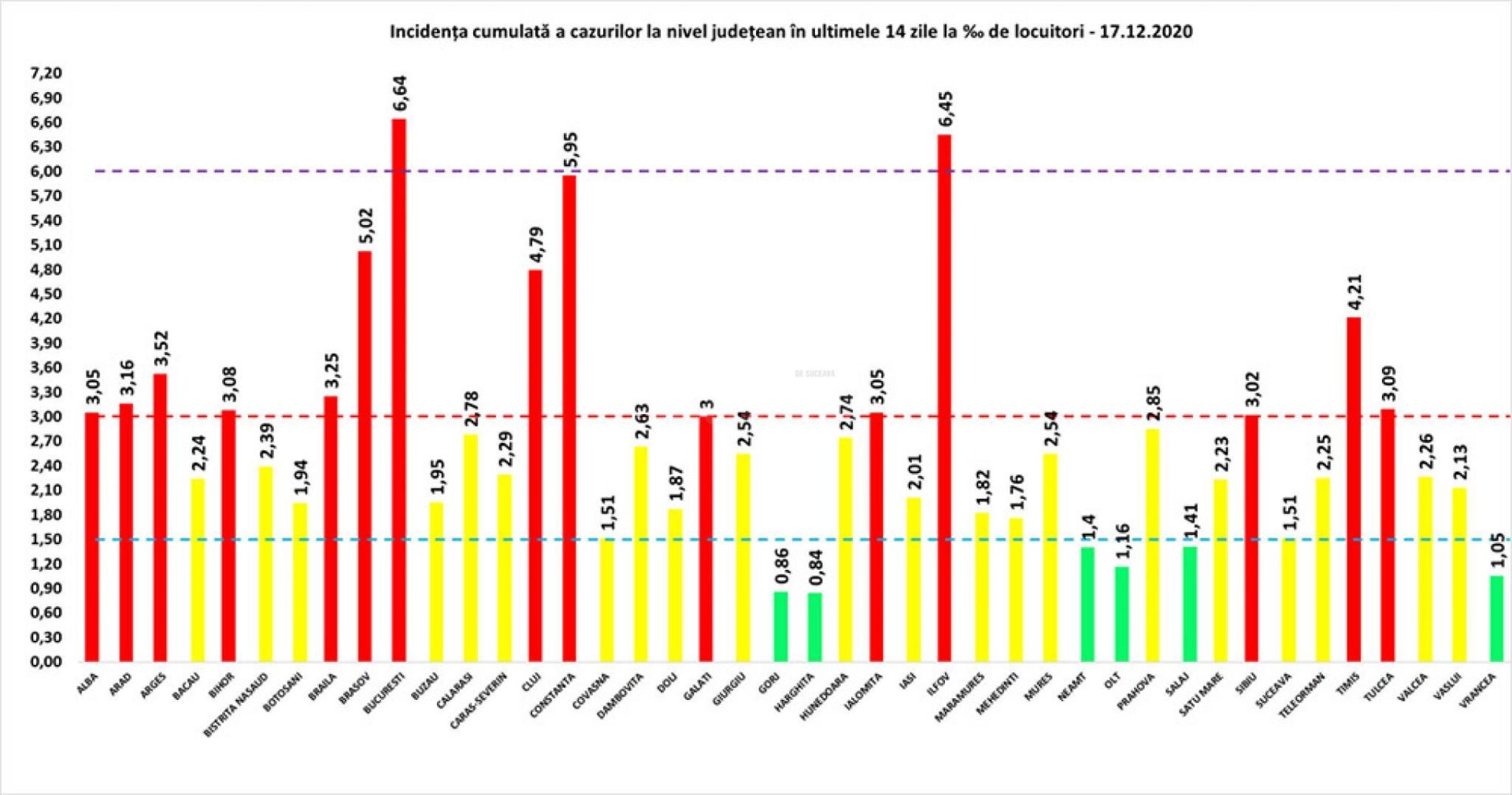 Cele mai multe cazuri noi sunt în București – 903, Ilfov – 340, Constanța – 305 și Iași – 300. În intervalul 16-17 decembrie, în țară au fost raportate 107 decese, dintre care 100 la pacienți care aveau comorbidități. În spitalele din țară, numărul total de persoane internate cu Covid-19 este de 11.860, dintre care aproape 1.300 ( 1.297 de pacienți) sunt cu forme severe de boală și sunt internate la ATI.