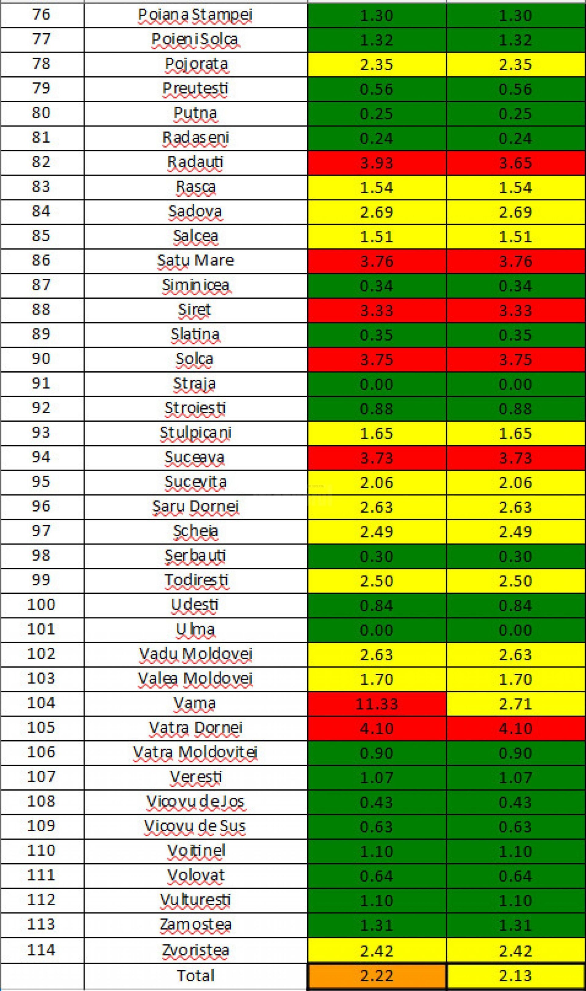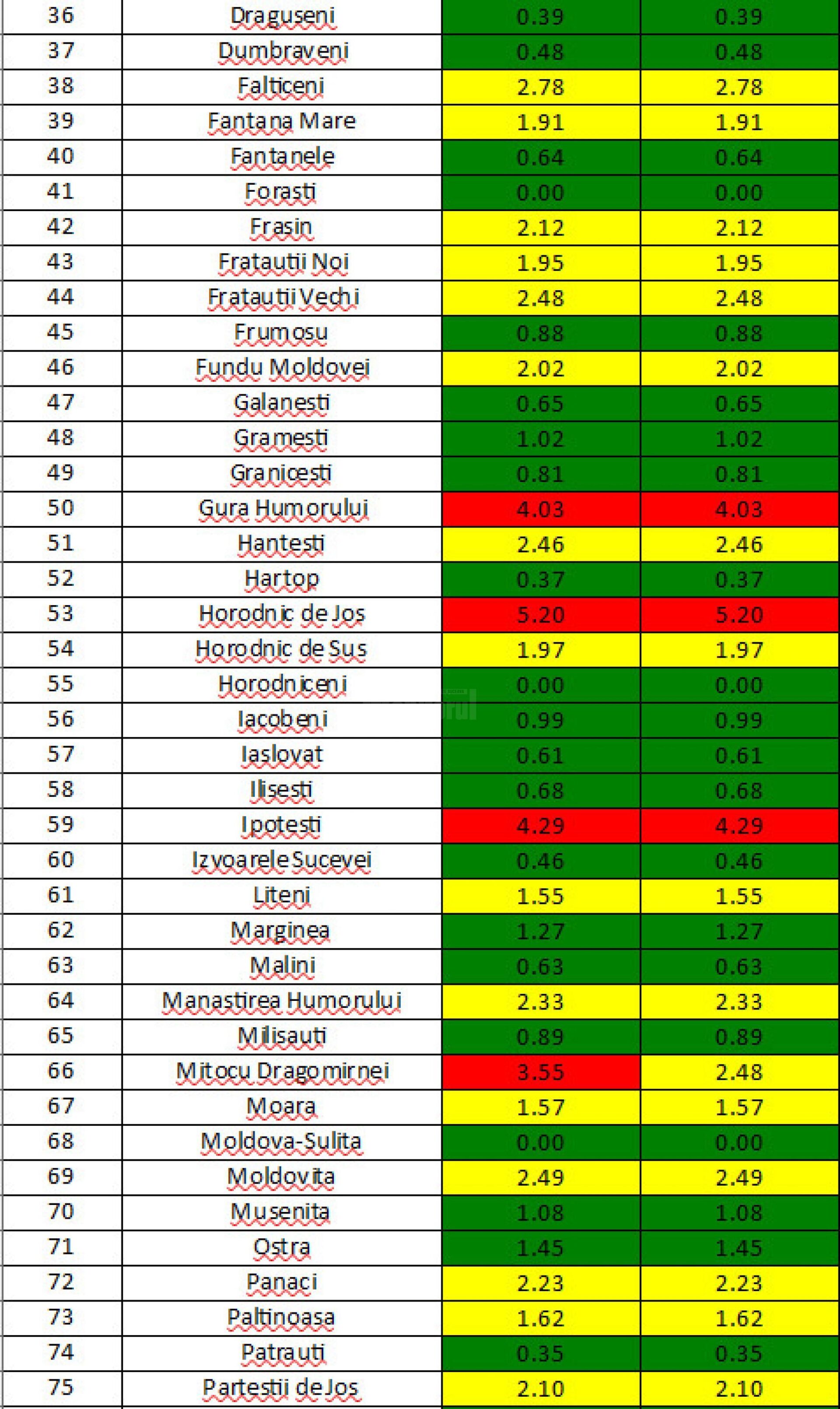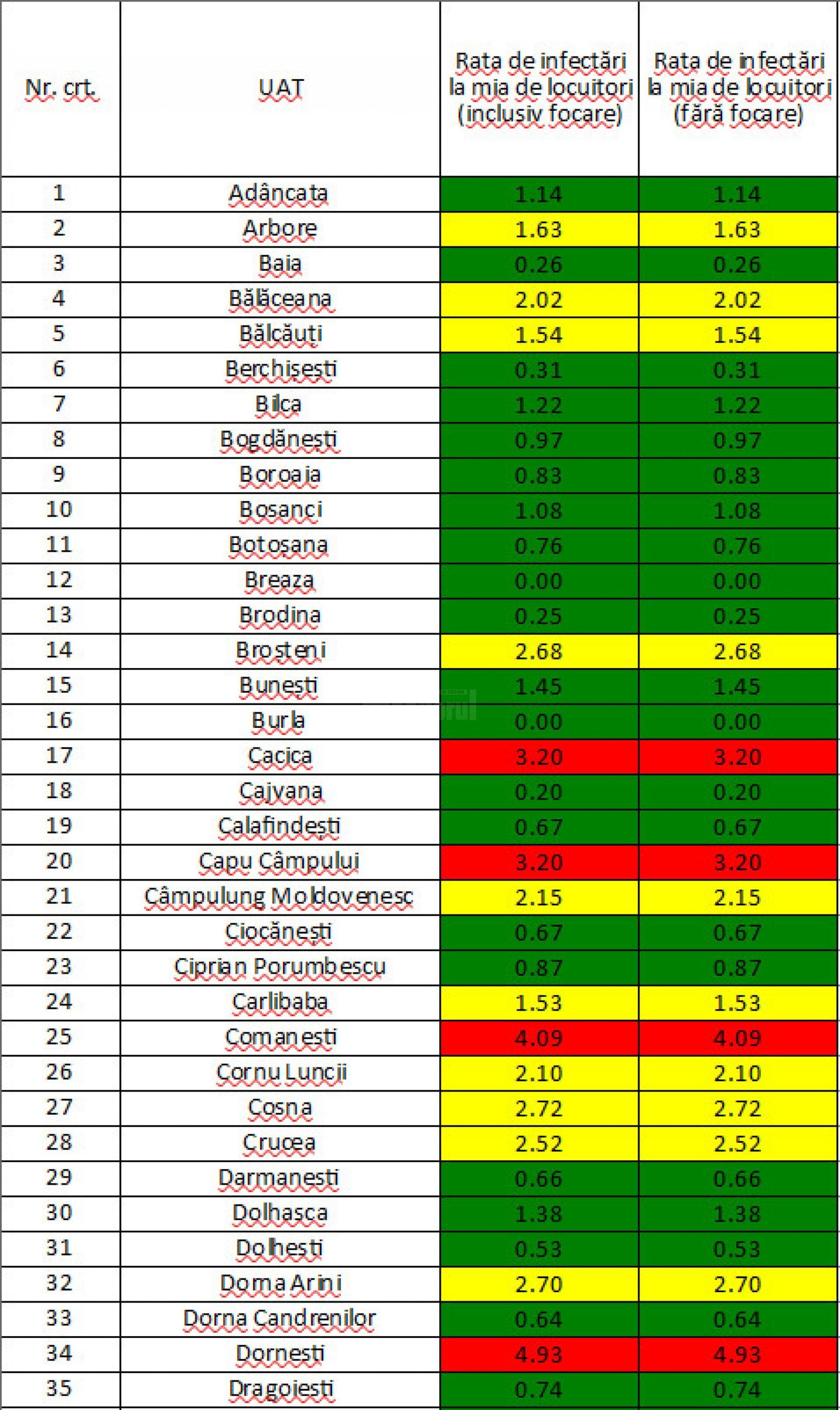 Conform distribuției cazurilor Covid-19 pe unități administrativ-teritoriale, din cele 114 unități administrativ-teritoriale, 7 nu au niciun caz de infecție Covid-19 în evoluție, 10 au câte un caz în evoluție, 34 au sub cinci cazuri în evoluție, 25 au sub zece cazuri în evoluție, iar 38 au peste zece cazuri în evoluție.