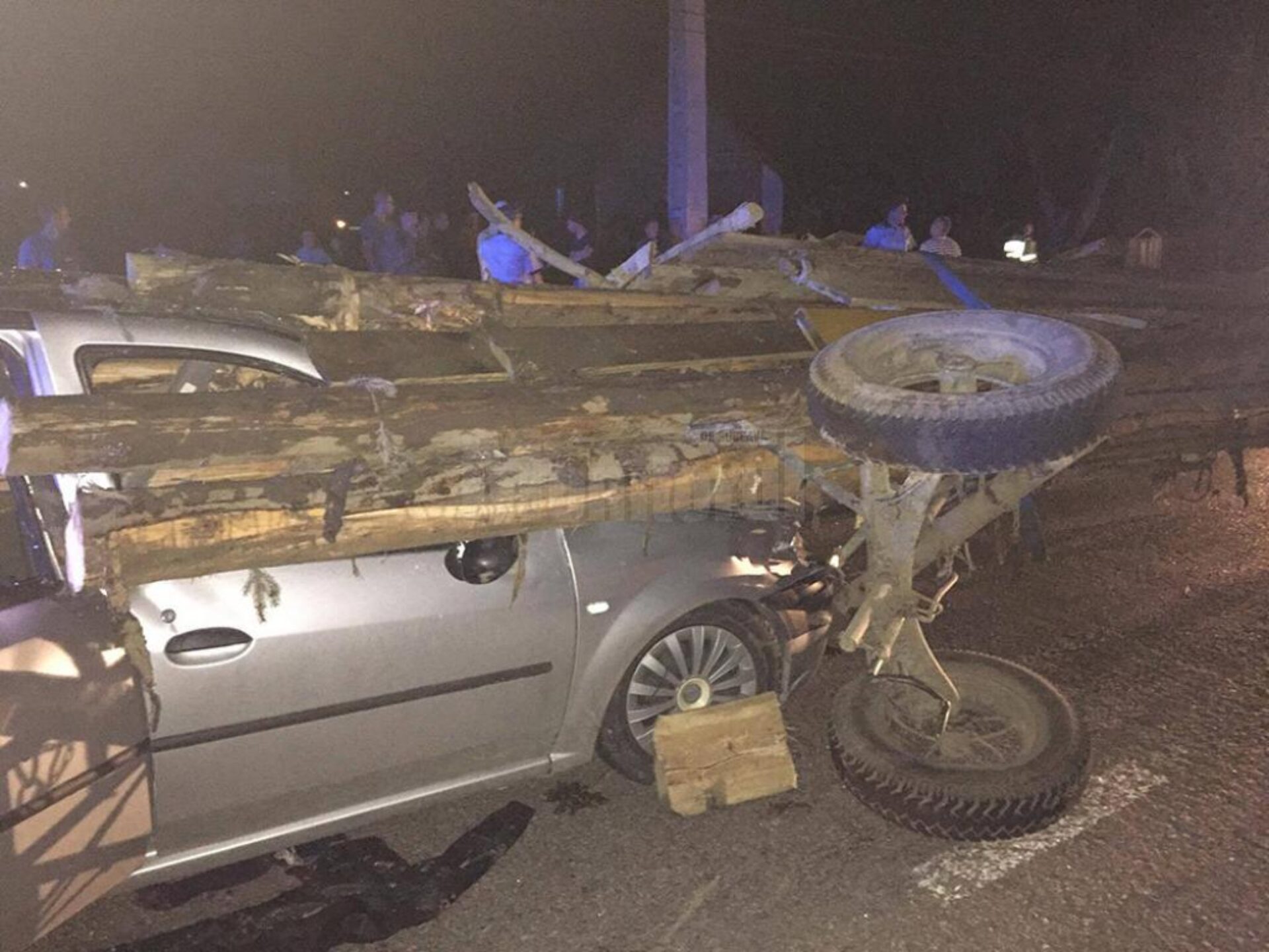 La volanul Daciei era spaniolul. Omul nu bănuia probabil că în România anului 2016 este posibil să întâlnești, pe un drum național-european, o căruță nesemnalizată, o adevărată capcană mortală. Autoturismul Dacia Logan a izbit frontal încărcătura de lemn ce depășea cadrul atelajului.