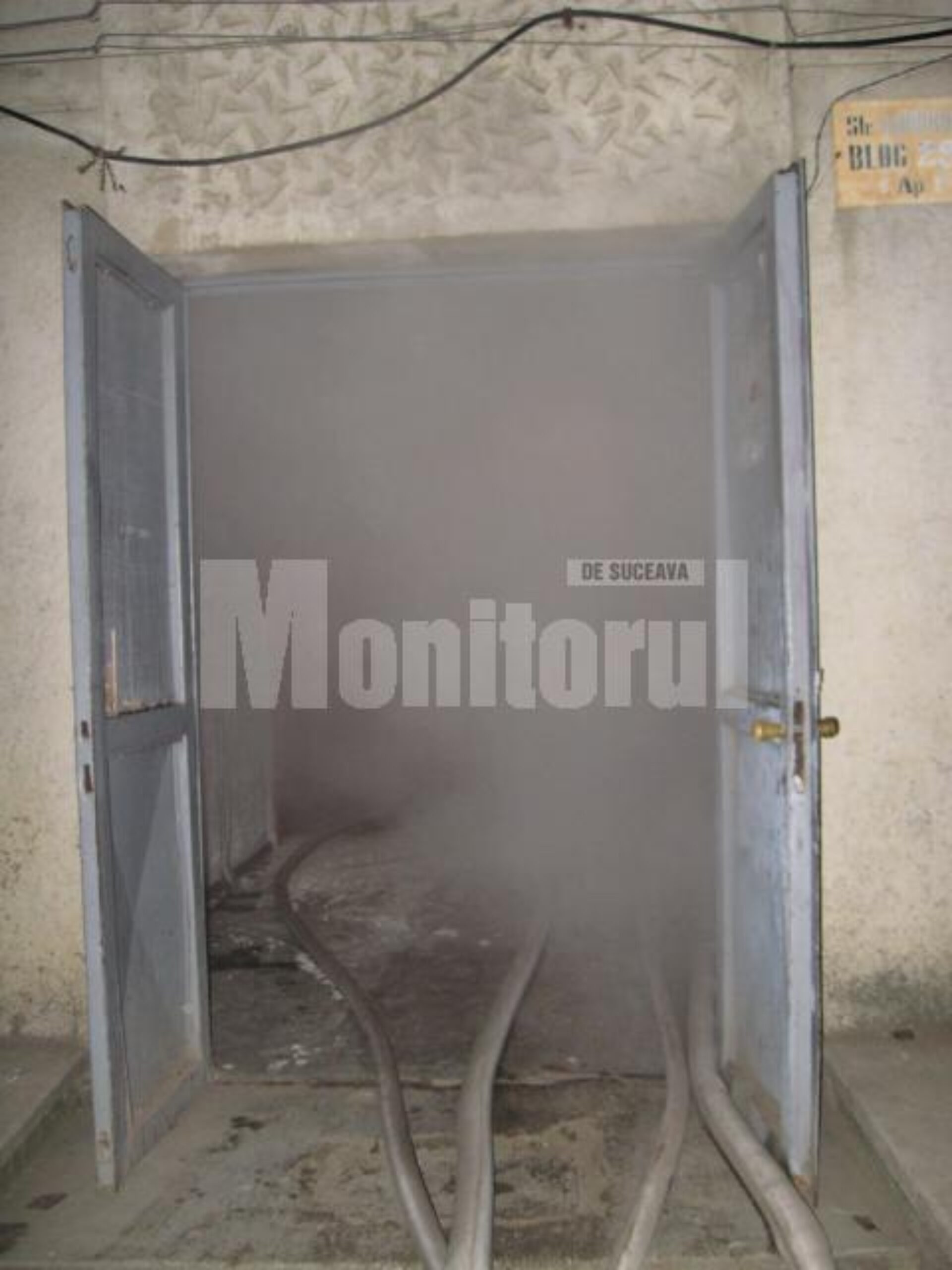 Aburul gros care ieșea de la subsolul blocului a făcut ca tencuiala de pe pereții holului să se prăbușească, în vreme ce ușile de lemn ale apartamentelor s-au umflat, de nu mai putea fi deschise sau închise.