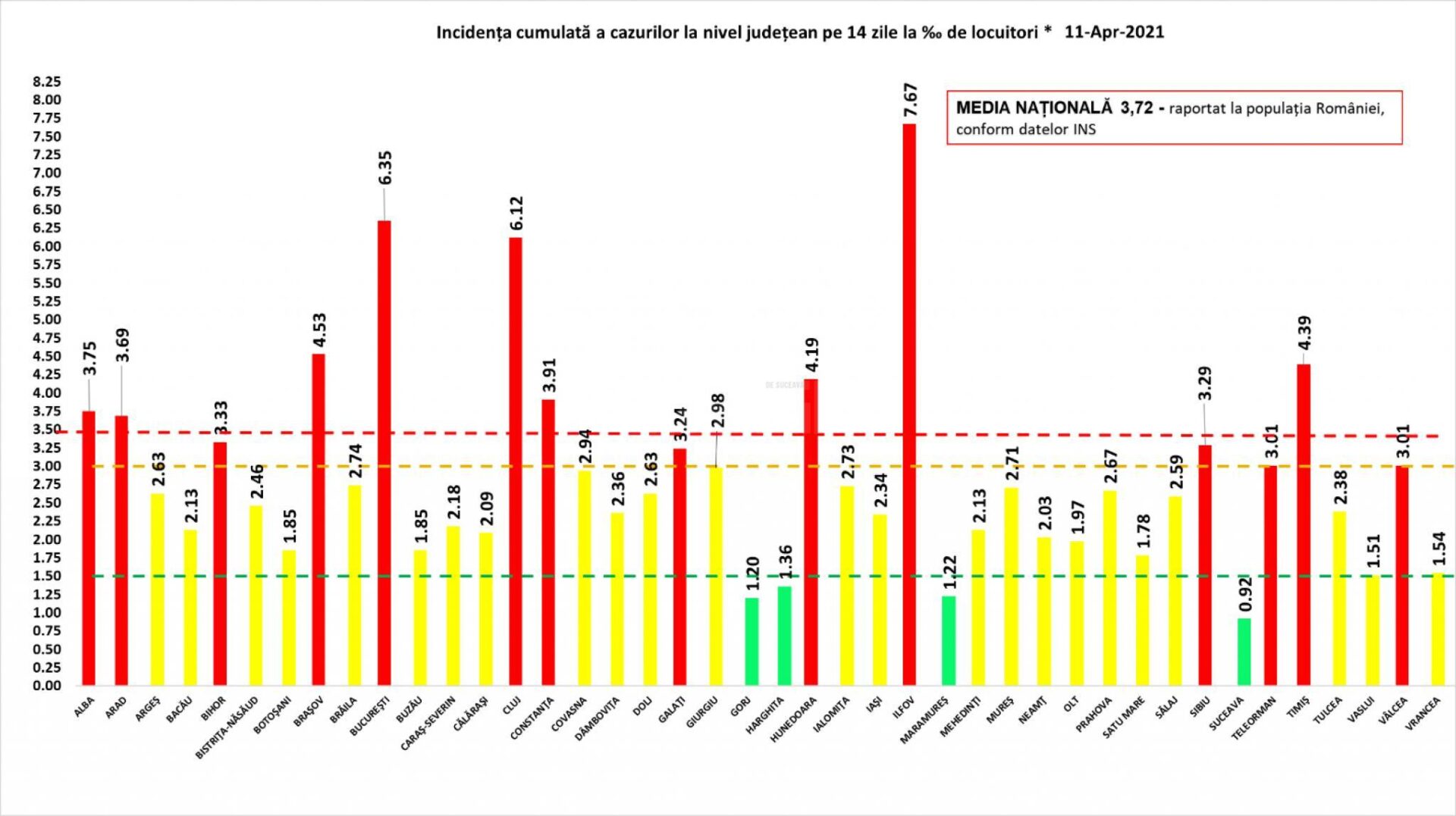La nivel național, în ultimele 24 de ore au fost efectuate 14.964 de teste RT-PCR (7.395 în baza definiției de caz și a protocolului medical și 7.569 la cerere) și 5.743 de teste rapide antigenice. De asemenea, de la ultima informare făcută de GCS, au fost raportate și rezultatele a 607 teste RT-PCR, prelucrate anterior ultimelor 24 de ore și transmise până la data de 11 aprilie a.c. În urma testelor, au fost înregistrate 3.302 cazuri noi de persoane infectate cu SARS – CoV – 2. În 11 județe și în București au fost duminică peste 100 de cazuri noi înregistrate, iar peste 200 de cazuri noi au municipiul București – 678 și județul Ilfov – 204. Duminică au fost raportate 129 de decese – 70 bărbați și 59 femei, 121 dintre decesele înregistrate fiind ale unor pacienți care au prezentat comorbidități.