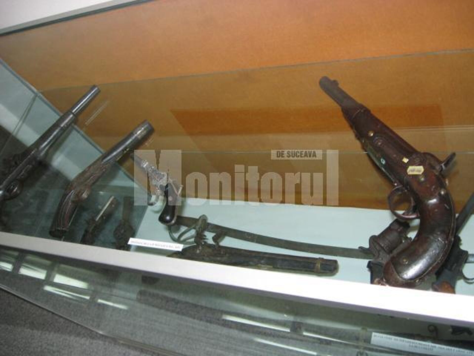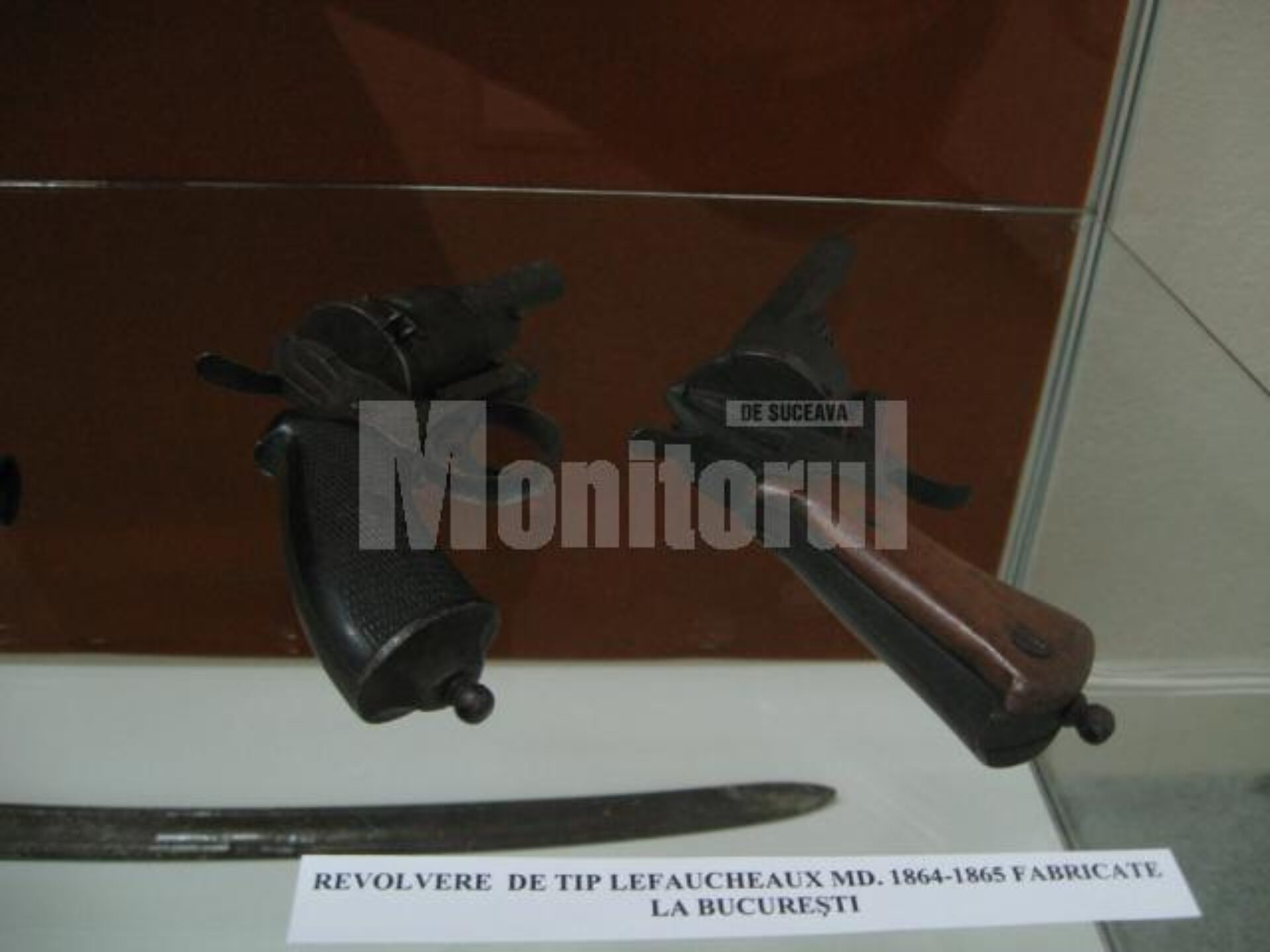 Sub sticla altor vitrine, arme de epocă: pistoale, revolvere (tip Lefaucheaux MD 1864-1865, fabricate la București) și săbii ofițerești.