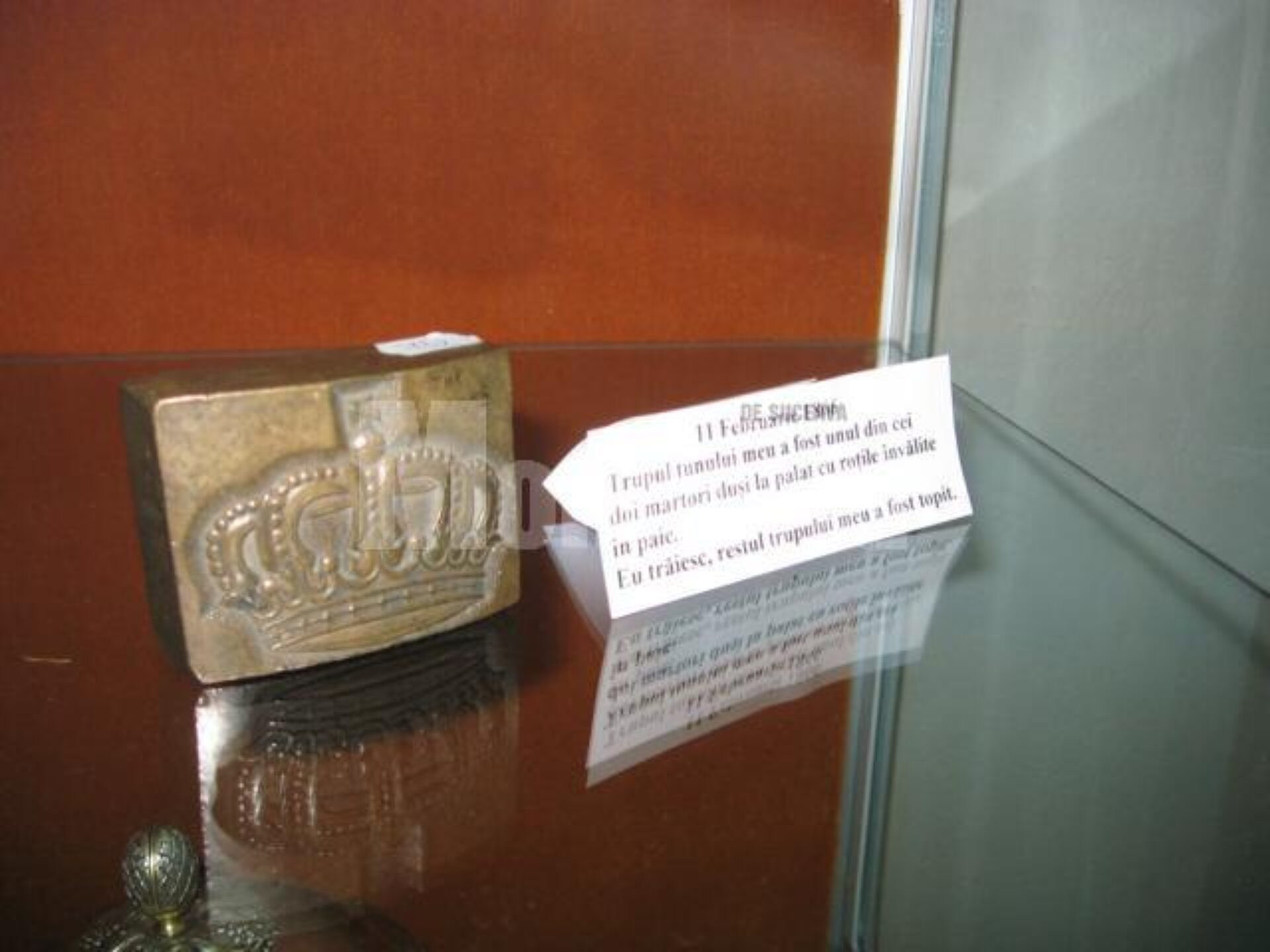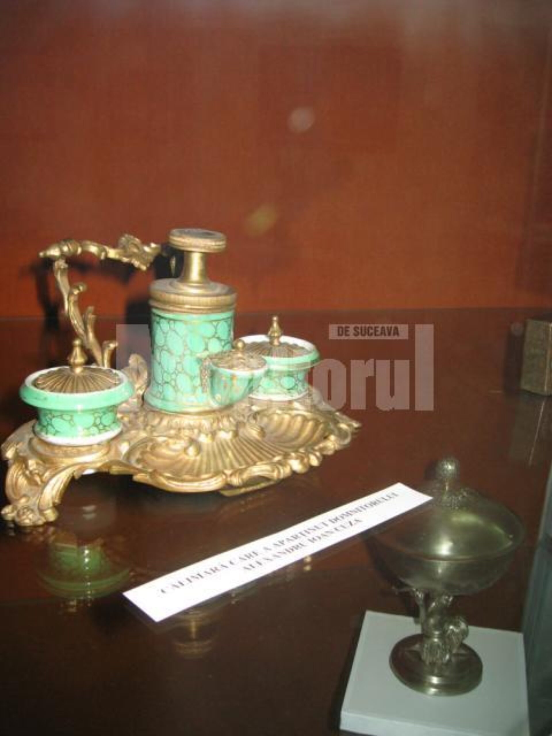 Într-o vitrină, o serie de obiecte personale care au aparținut domnitorului: o călimară masivă cu decor baroc, o pereche de pinteni, un pumnal de vânătoare și un press-papier din bronz, decupat din țeava unui tun, datat 11 februarie 1866.