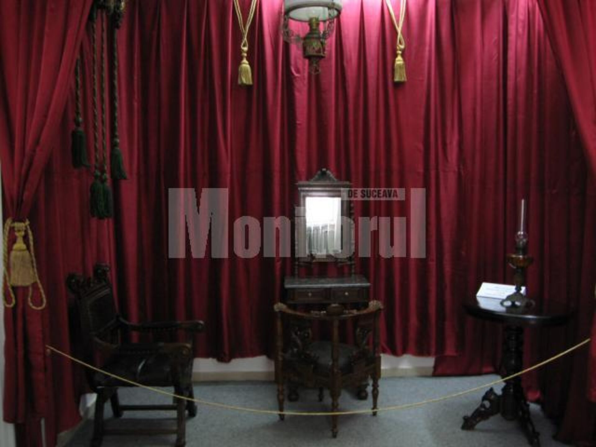 În încăperea alăturată, ambientul de epocă a fost realizat printr-o serie de piese de mobilier: scaune cu tapițerie din piele, o noptieră cu oglindă, o măsuță ovală cu motiv decorativ sculptat. Atmosfera este întregită de draperii grele din pluș vișiniu, cu șnururi cu ciucuri aurii, și de o lampă cu cilindru.