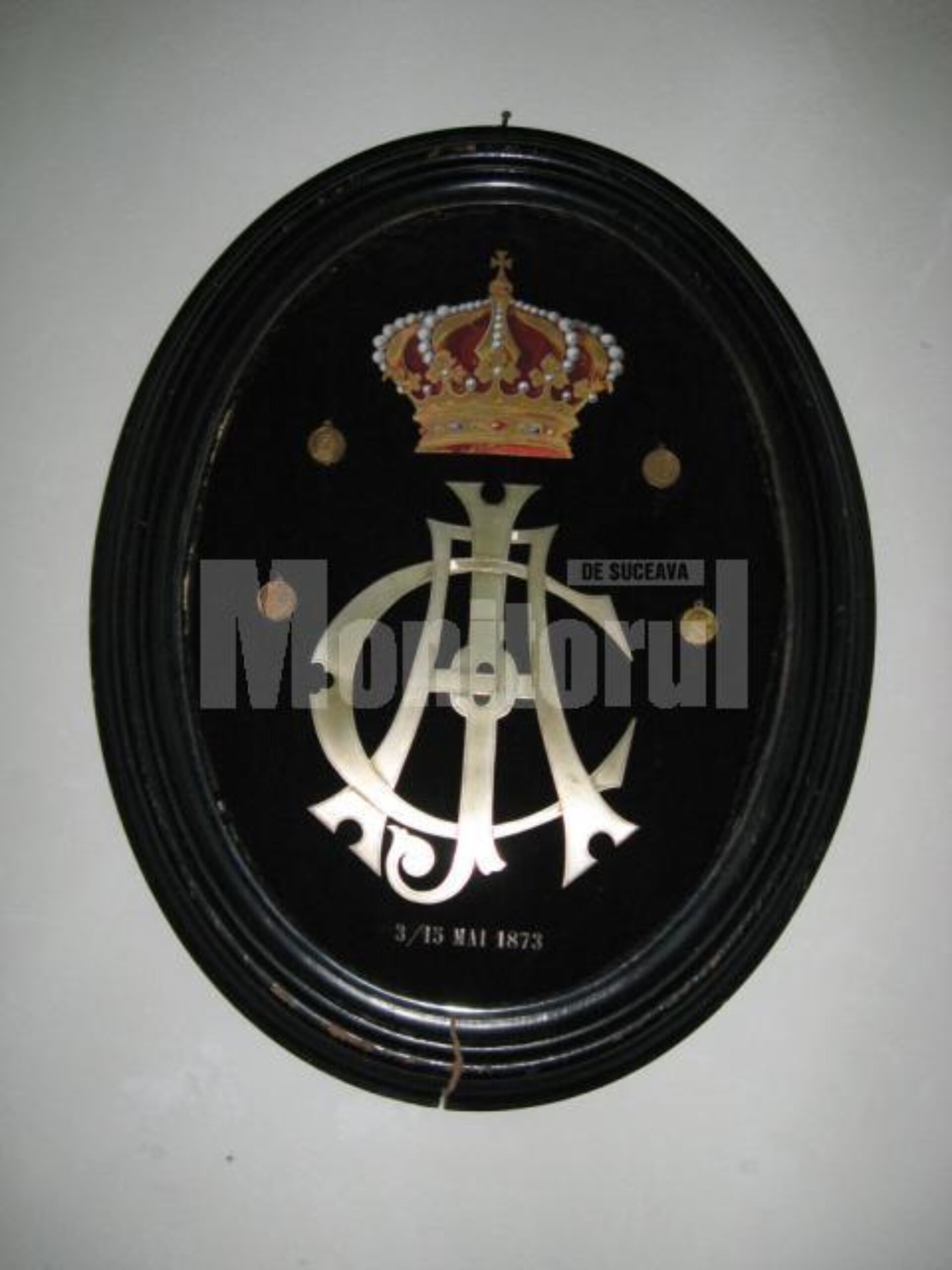 Pe un panou oval, o monogramă cu litere aurite a domnitorului.