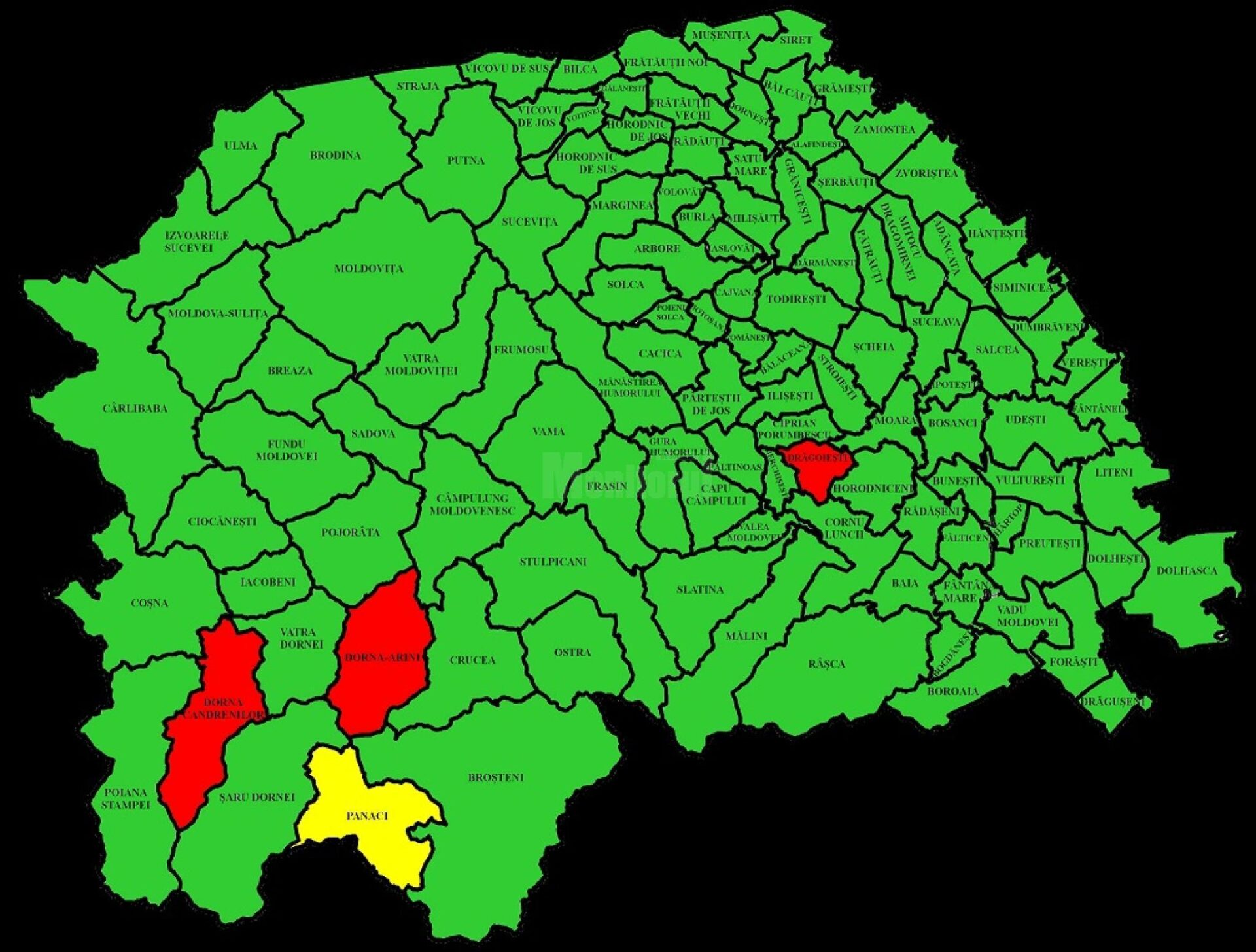 Trei localități, Dorna Arini, Dorna Candrenilor și Drăgoiești, sunt încă în scenariul roșu, o singură comună, Panaci, mai este în scenariul galben, iar celelalte localități sucevene sunt toate în zona verde.