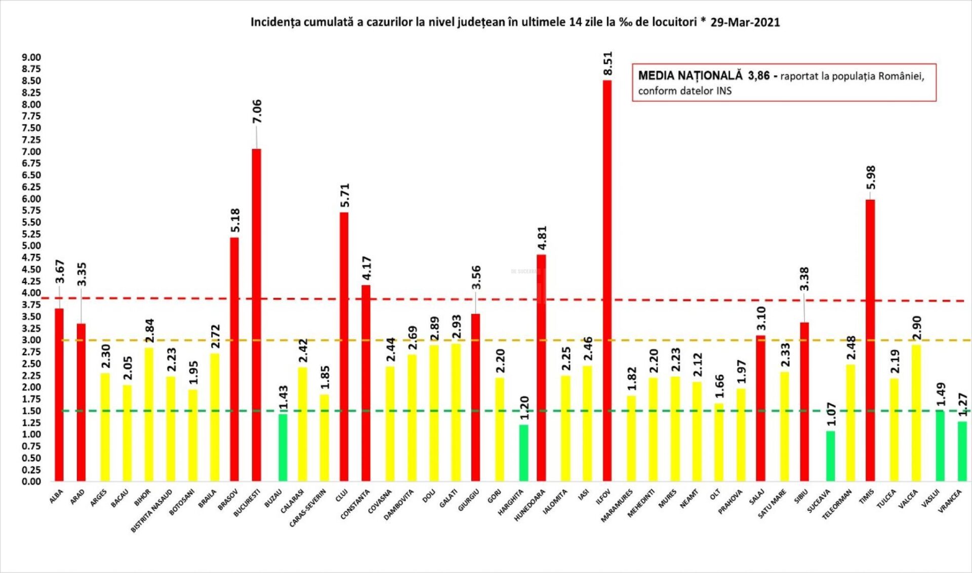 În țară în ultimele 24 de ore au fost efectuate 8.353 de teste RT-PCR (6.323 în baza definiției de caz și a protocolului medical și 2.030 la cerere) și 6.002 teste rapide antigenice și au fost înregistrate 3.825 de cazuri noi de persoane infectate cu SARS – CoV-2. Peste 200 de cazuri noi au județele Ilfov – 327, Constanța – 288, Cluj – 280 și municipiul București -1.105 de cazuri noi. Cele mai mari incidențe sunt în județul Ilfov – 8,51 la mie și în București – 7,06 la mie.