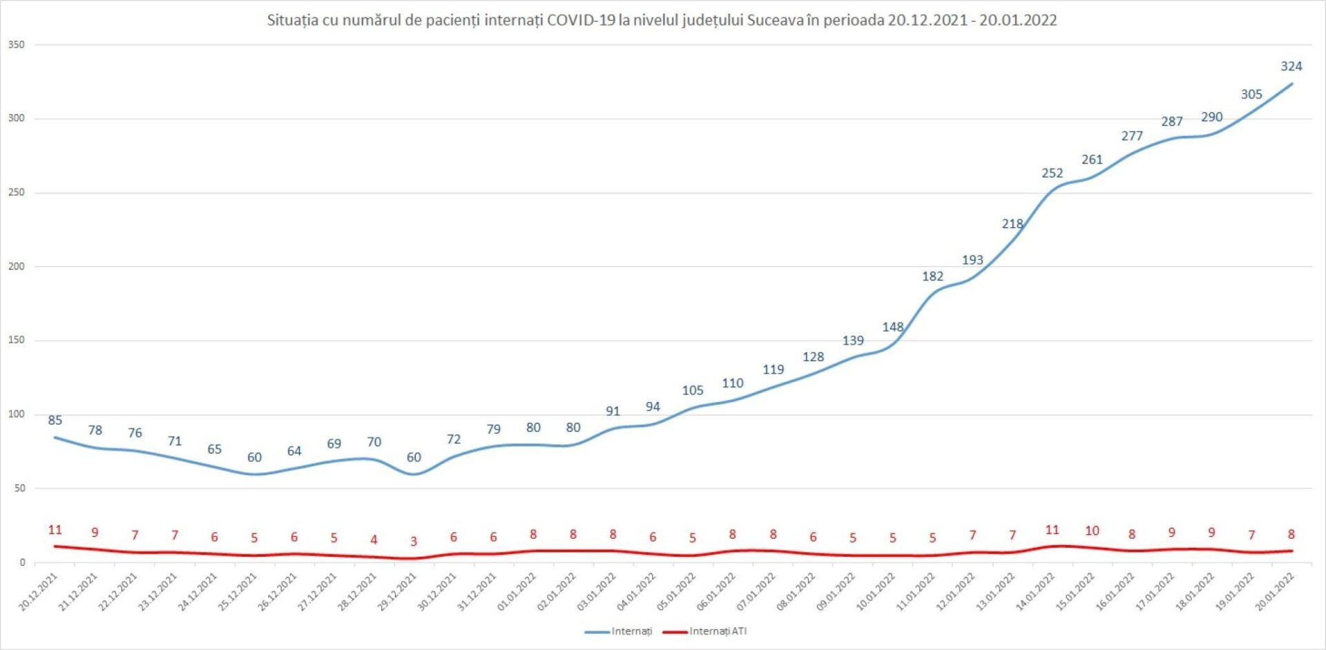 Totalul persoanelor internate în spitalele din județul Suceava, diagnosticate cu Covid-19, este de 324 (din care 28 copii), iar numărul persoanelor suspecte de Covid-19 este de 29.