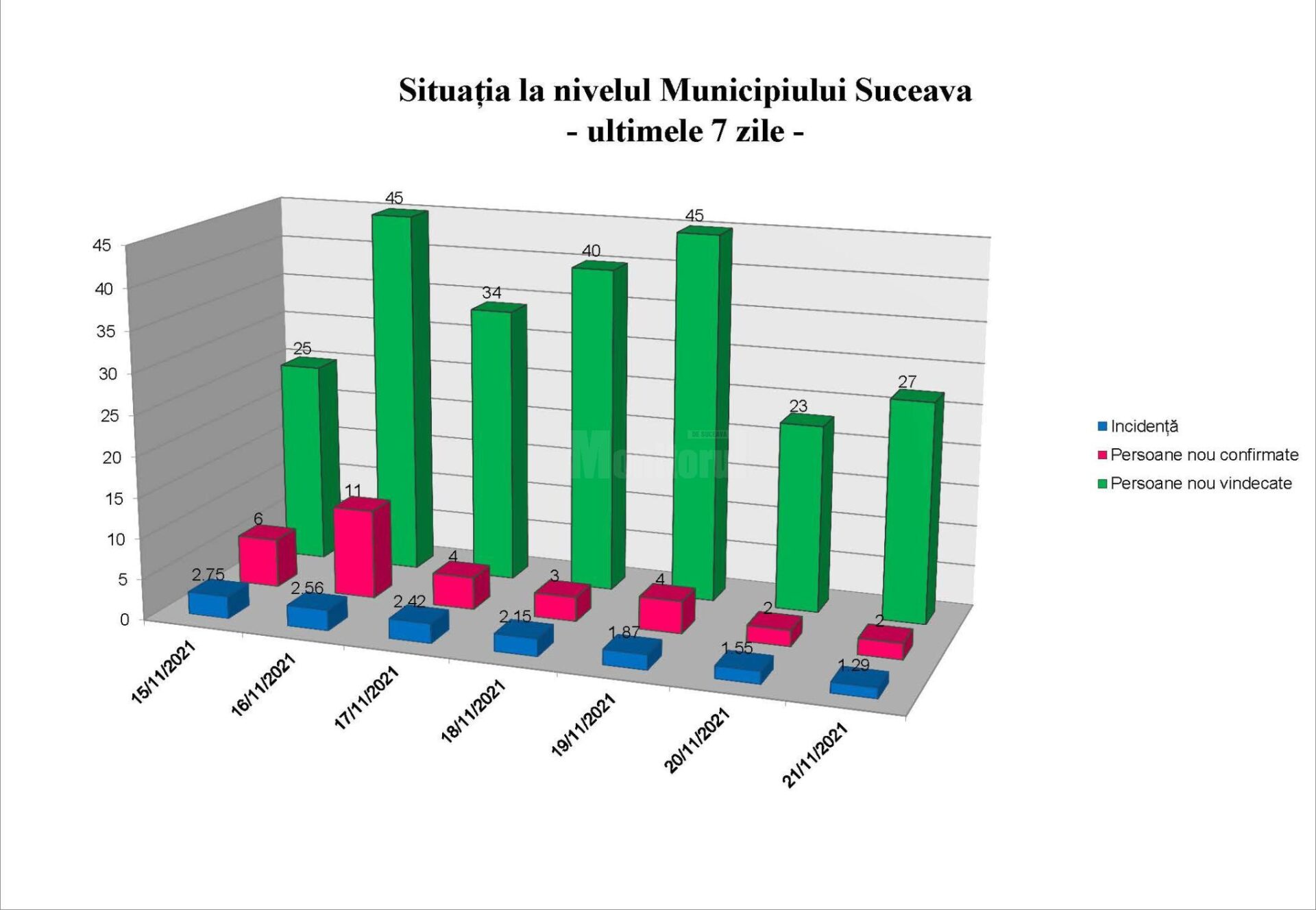 Vestea bună este că indicele de pozitivare a cazurilor a scăzut, de la 11,14 % pe 8 noiembrie a.c., la 4,30 % pe 21 noiembrie. Față de zilele anterioare, însă, este mai ridicat – în data de 17 noiembrie a fost de 3,03%, cea mai mică valoare din ultimele 14 zile. Situația s-a îmbunătățit și în municipiul Suceava, unde în ultimele zile numărul cazurilor noi de infectare a coborât de la patru la două cazuri noi.