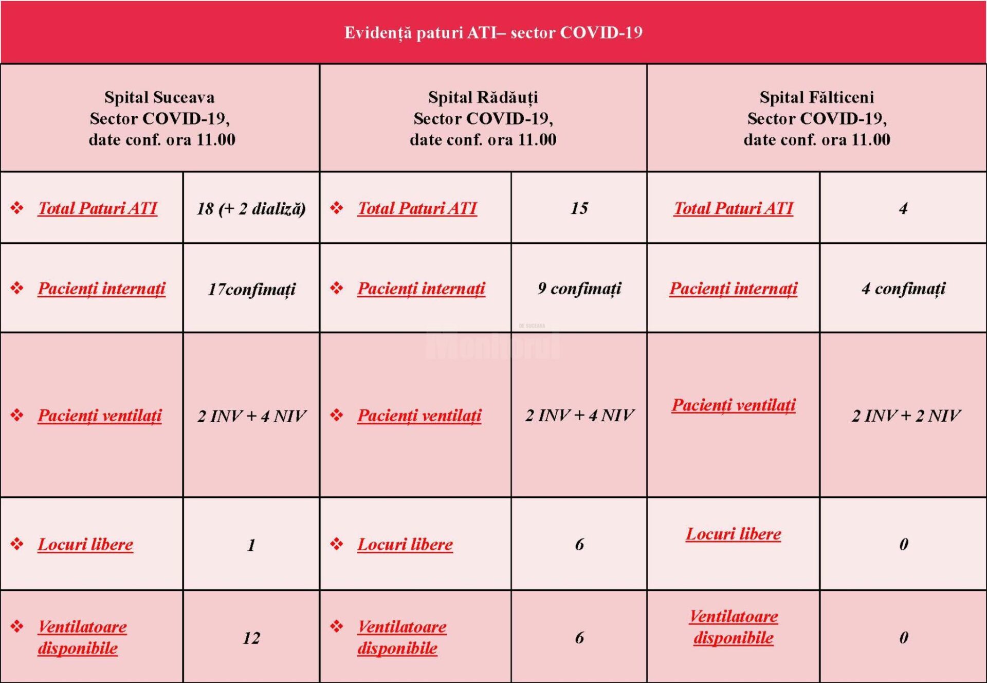 În Spitalul Județean de Urgență „Sf. Ioan cel Nou” Suceava sunt internați 77 de pacienți cu Covid, din care 39 cu forme severe și 17 cu forme grave, la ATI (2 pacienți ventilați non – invaziv și 4 pacienți intubați, ventilați invaziv). Pacienți cu forme severe și grave de Covid mai sunt la Rădăuți- 13, din 35 de pacienți cu Covid internați, Câmpulung Moldovenesc – 8 pacienți, Vatra Dornei – 7 pacienți și Fălticeni – 9 pacienți cu forme severe și grave. În carantină sunt 2.528 de persoane, din care 122 din ultimele 24 de ore, iar în izolare, în afara celor aflate în spital, se află 746 persoane, din care 28 din ultimele 24 de ore.