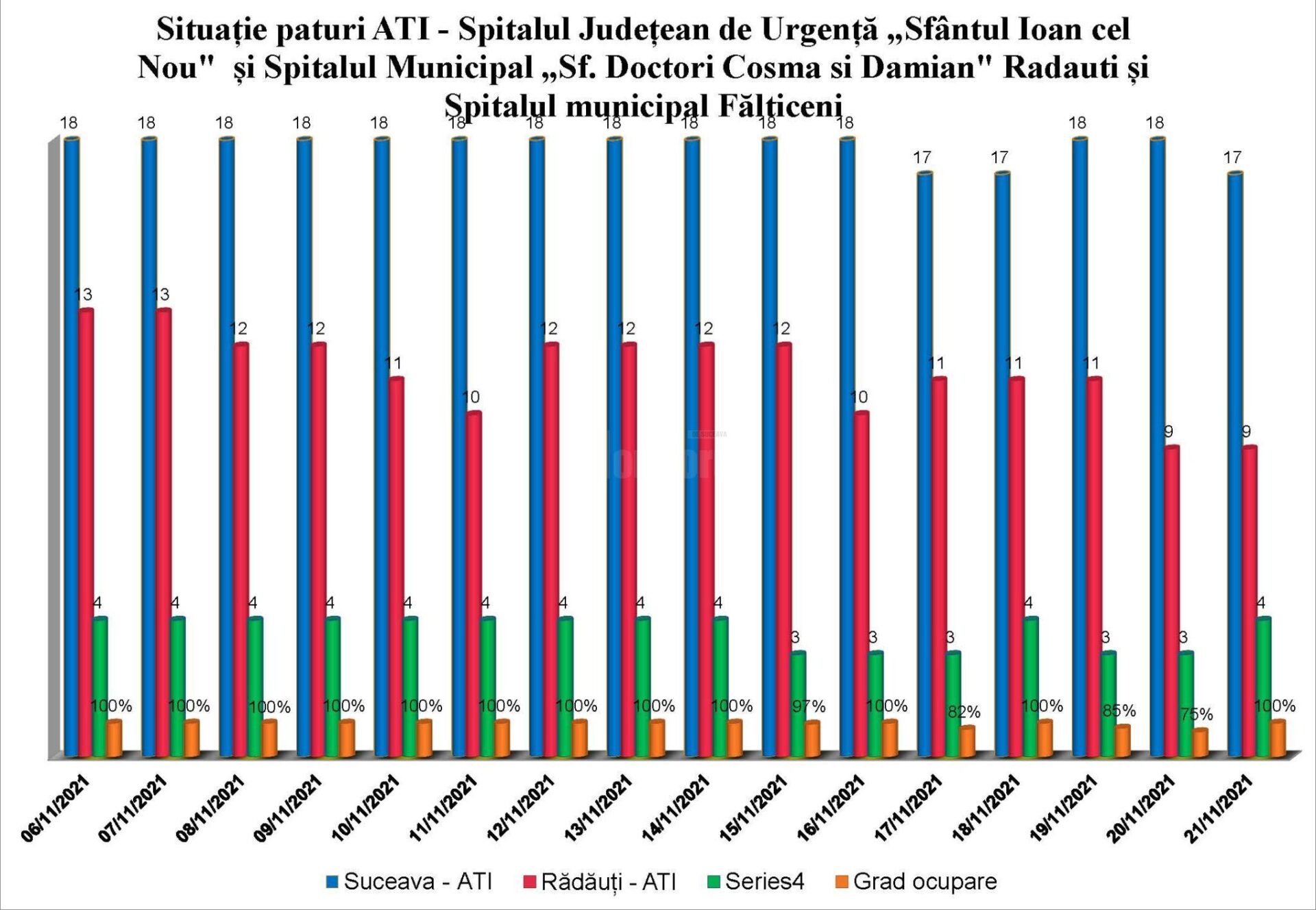 Numărul pacienților cu forme grave și severe de Covid internați în spitalele din județul Suceava se menține ridicat. Conform buletinului zilnic de presă remis de Prefectura Suceava, în intervalul 20-21 noiembrie în spitalele din județ au fost internate 13 persoane cu Covid – 19 și au fost externate 13 persoane. În aceeași perioadă de referință au decedat două persoane ca urmare a infecției Covid. Duminică dimineață, erau internați 208 pacienți cu Covid, dintre care 30 au forme grave de boală și sunt internați la secțiile ATI ale spitalelor din Suceava, Rădăuți și Fălticeni, iar alți 63 au forme severe, cu risc mare de agravare.