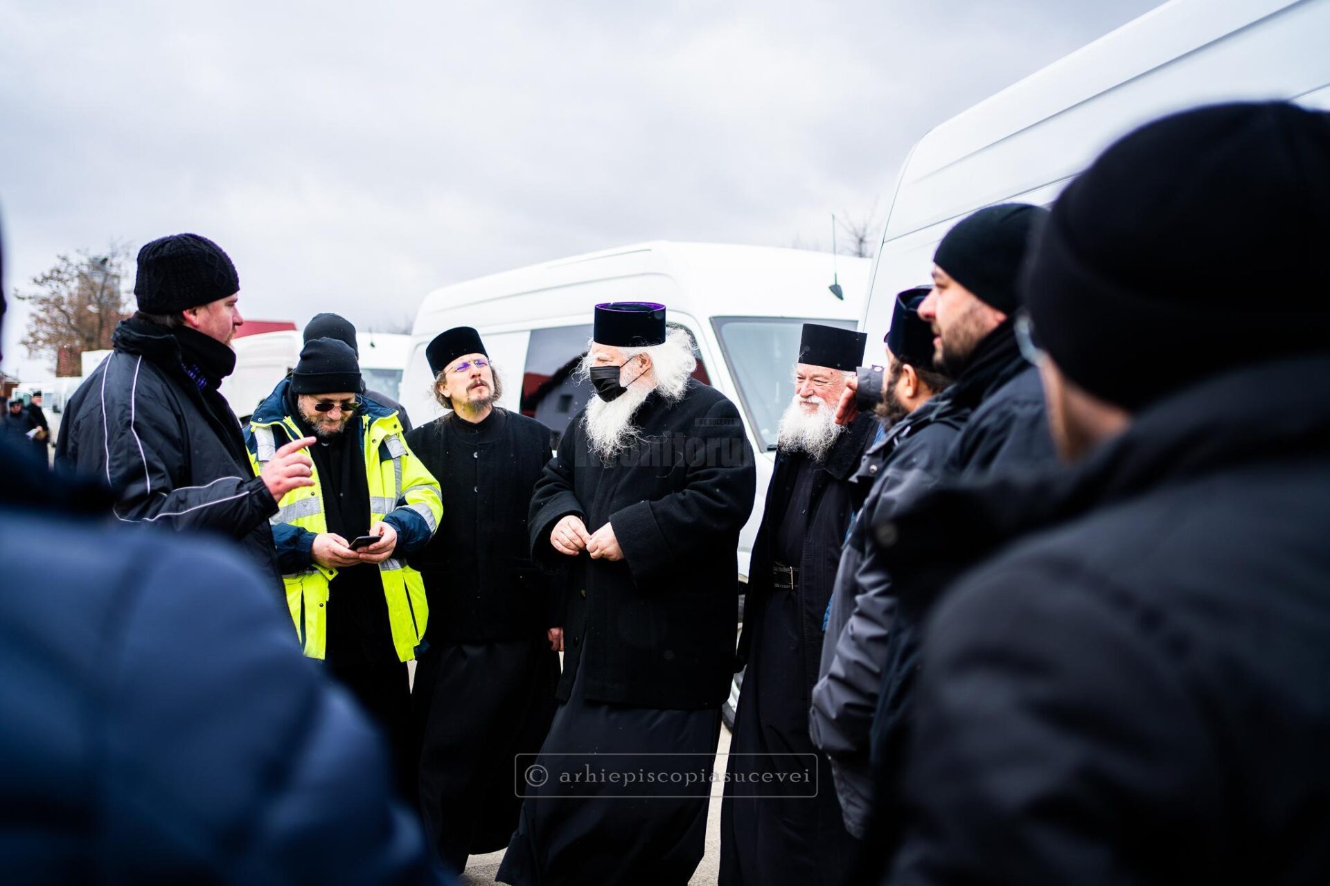„Ca și în celelalte zile, arhipăstorul Sucevei și Rădăuților, Înaltpreasfințitul Părinte Calinic, a fost prezent atât la Așezământul «Sfântul Ierarh Leontie» pentru a binecuvânta și supraveghea îndeaproape lucrarea de organizare a convoiului umanitar, cât și la Punctul de Trecere a Frontierei Siret, însoțind delegația până la încheierea formalităților vamale. S-a îndreptat apoi spre centrul de coordonare a voluntarilor, pentru a afla ultimele detalii și a discuta despre oportunitatea diversificării măsurilor de intervenție. La final a adresat mulțumiri tuturor voluntarilor și un cuvânt de încurajare celor greu încercați”, transmit reprezentanții Arhiepiscopiei Sucevei.
