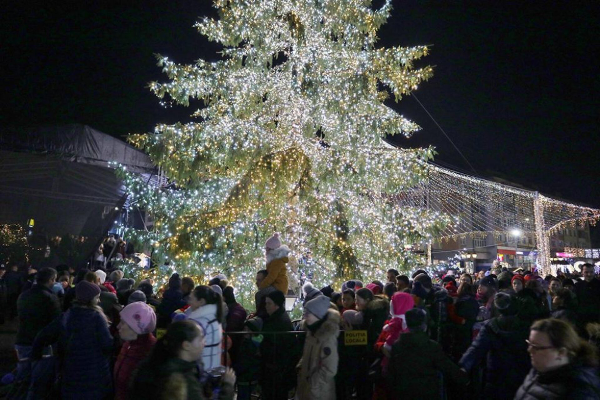 Atât cei care au urcat pe scenă, să colinde publicul, cât și cei care se aflau încolonați pe un culoar special format și păzit de Poliția Locală, în jurul bradului, au avut ocazia să se întâlnească față în față cu Moș Crăciun, care a venit, chemat fiind de primarul Ion Lungu și de oamenii din public.