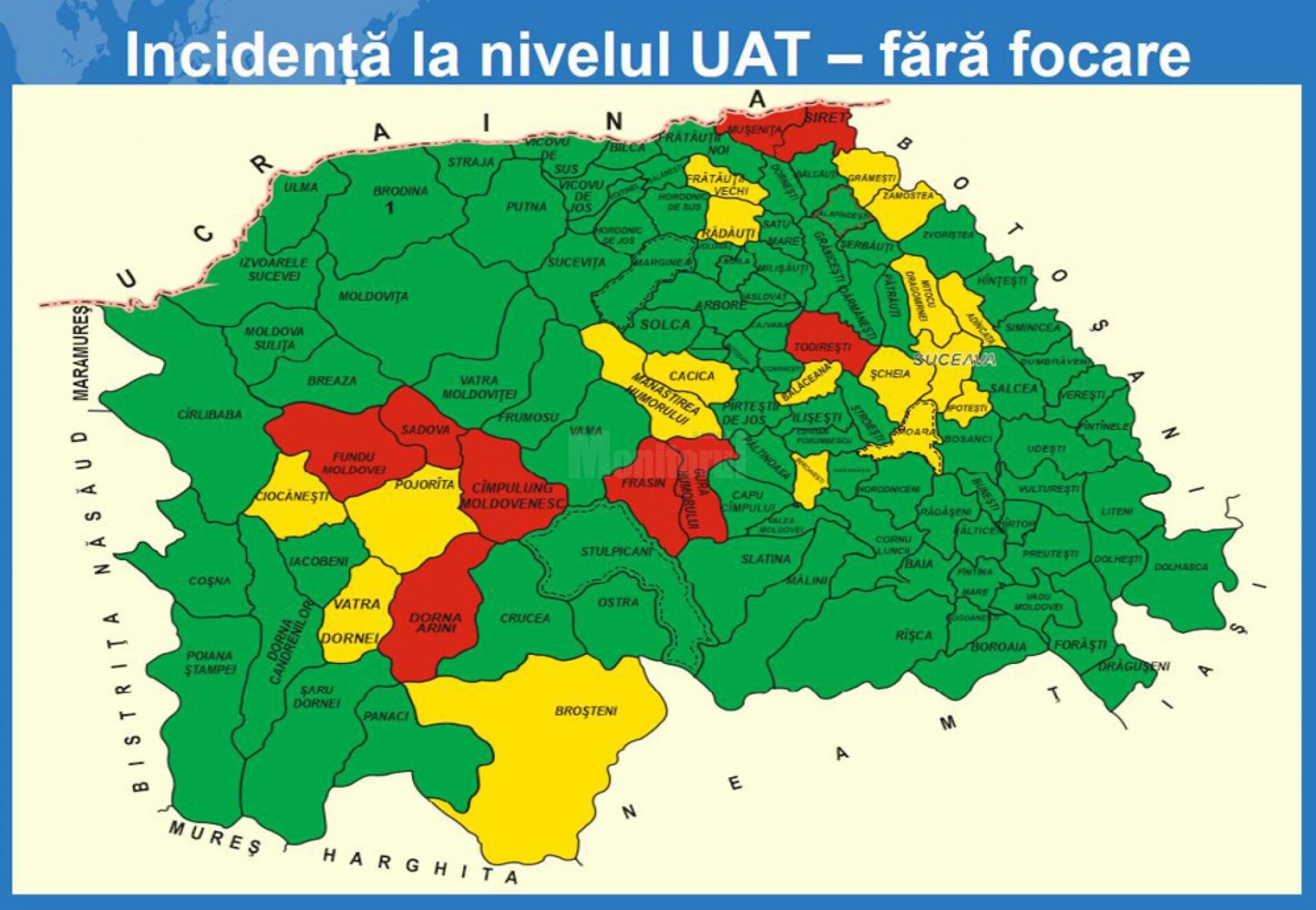 Luând în considerare focarele, cea mai ridicată incidență a cazurilor de infectare la mia de locuitori se înregistrează la Solca, de 8,24, apoi la Pojorâta – 7,05 și la Siret- 6,54. Fără focare pe primul loc se plasează Siret, cu o incidență de 6,54 de cazuri pozitive la mia de locuitori, urmat de Dorna Arini, cu 4,05 și Todirești, cu 3,93.