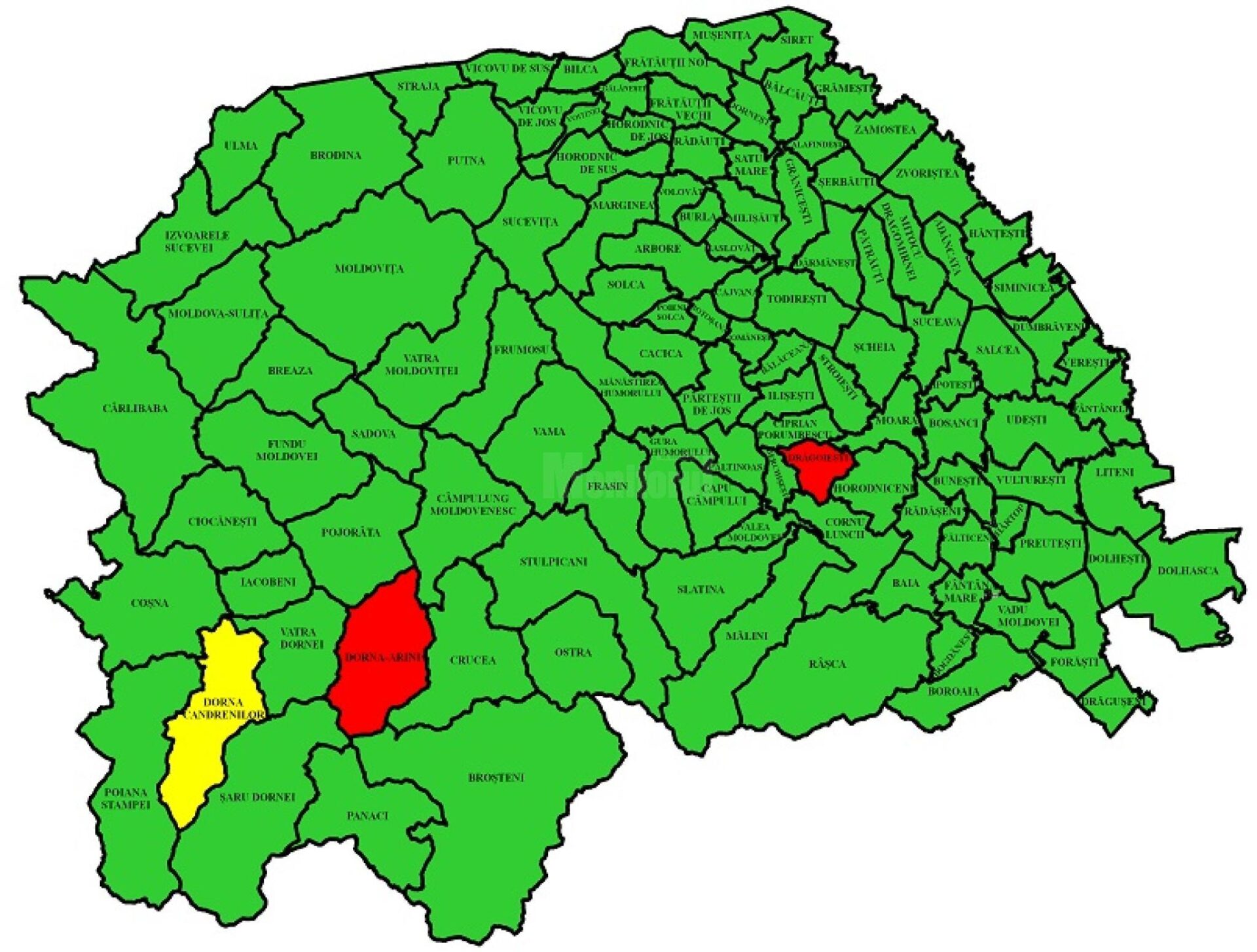 În județul Suceava mai sunt două localități în scenariul roșu, Dorna Arini și Drăgoiești și o localitate în scenariul galben, Dorna Candrenilor.