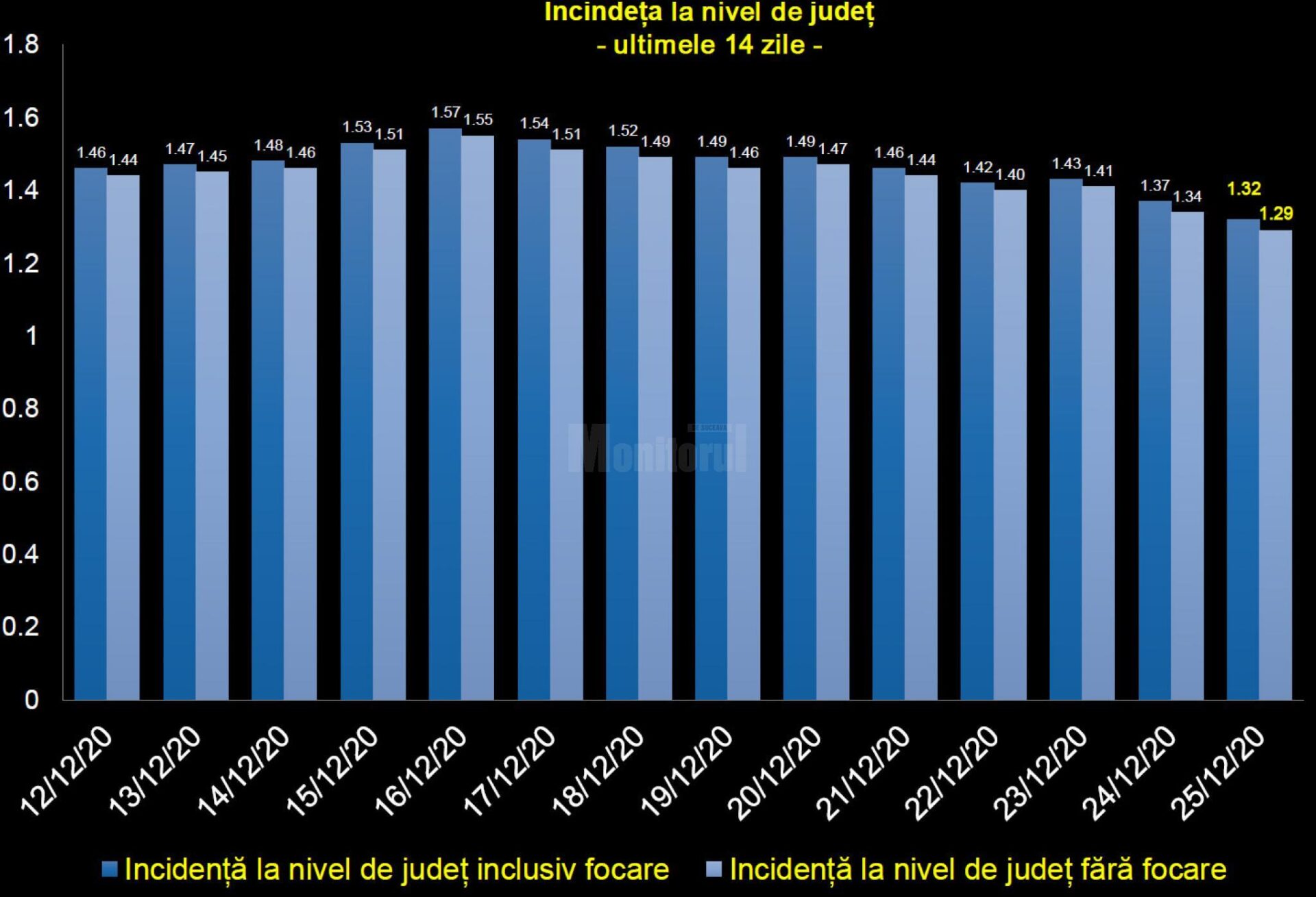 Județul Suceava a înregistrat 35 de cazuri noi de infectare cu SARS-CoV-2 și 3 pacienți reconfirmați pozitiv la retestare, în prima zi de Crăciun, din 179 de persoane testate. Incidența cazurilor pozitive la nivelul județului a coborât la 1,29 la mia de locuitori.