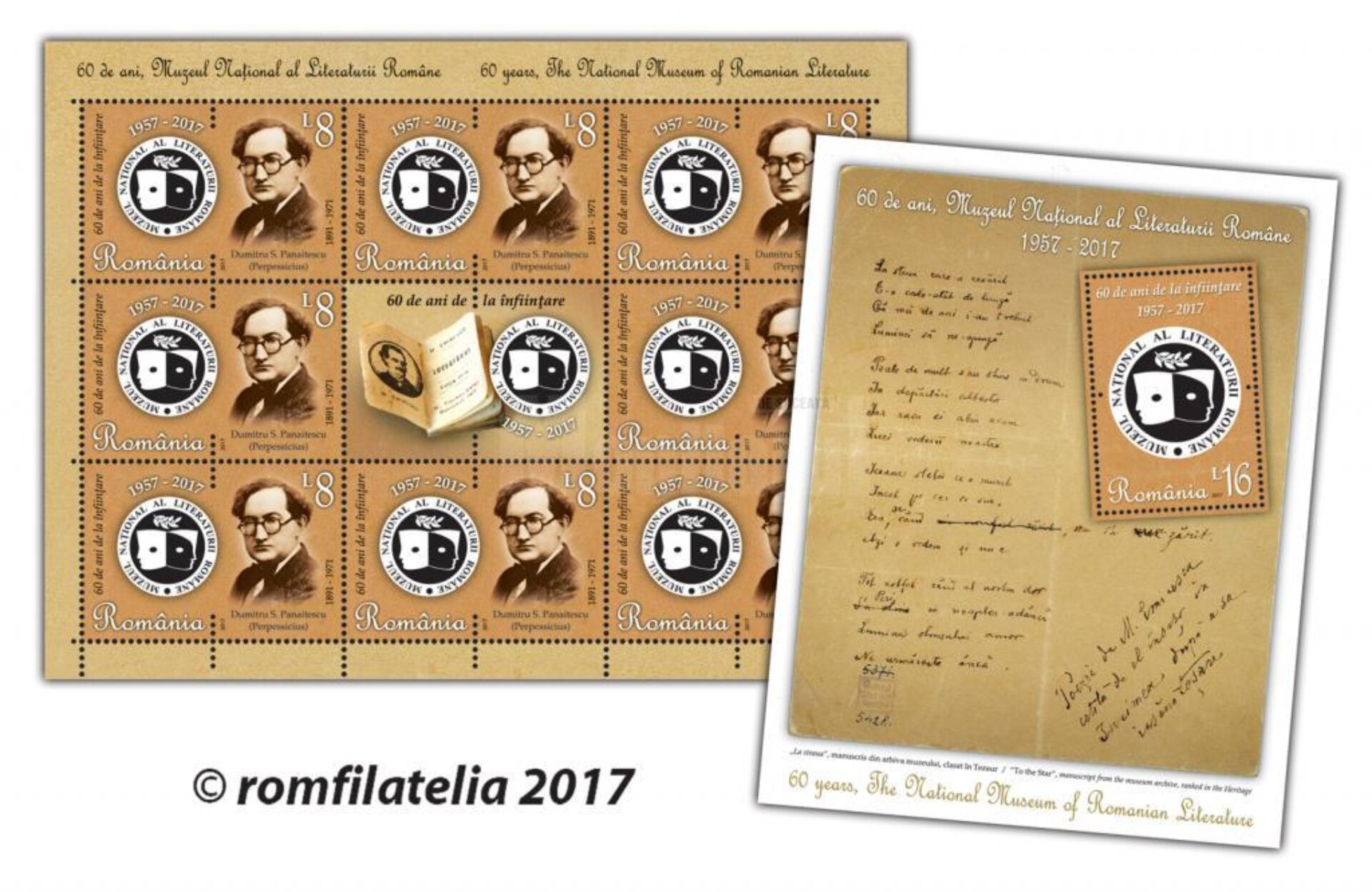 Romfilatelia marchează împlinirea a șase decenii de la înființarea Muzeului Național al Literaturii Române printr-o emisiune de mărci poștale care intră în circulație începând cu data de 17 mai a.c.