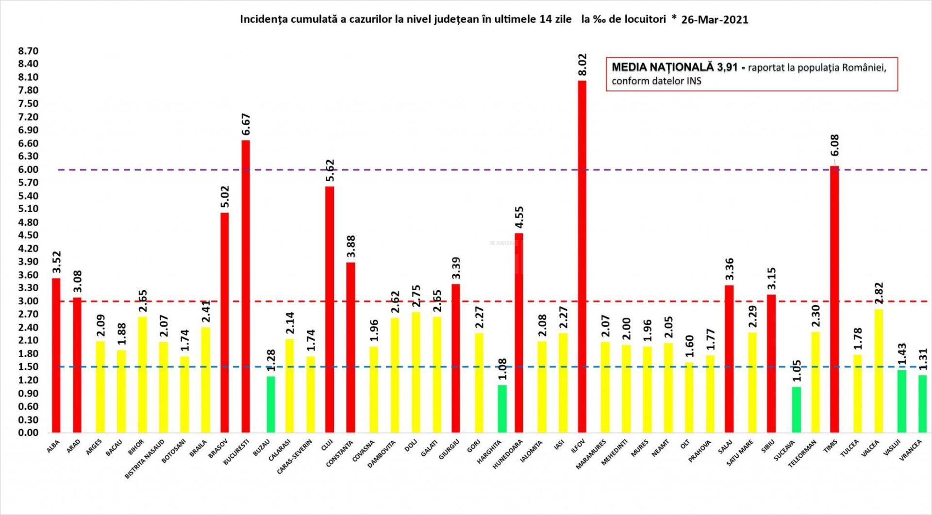 În țară, a crescut numărul județelor care înregistrează peste 200 de cazuri noi zilnic: Cluj – 353, Timiș – 346, Brașov – 331, Ilfov – 308, Constanța- 300, Galați – 209, Hunedoara – 203 și municipiul București – 1.286 de cazuri noi.