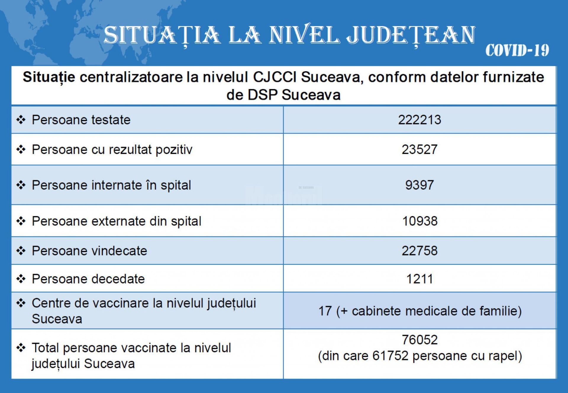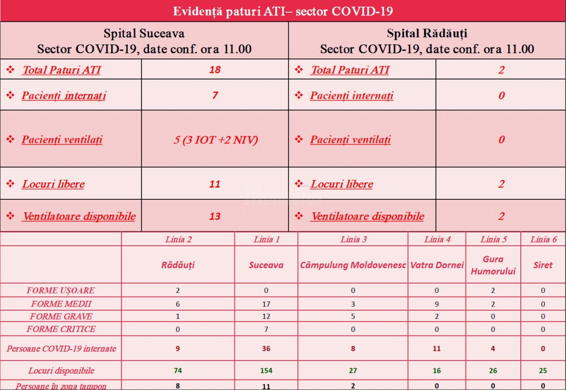 În spitalele din județ, în ultimele 24 de ore au fost internate 11 persoane diagnosticate cu Covid-19, în același interval de timp fiind externate 9 persoane declarate vindecate. În spitalul din Suceava, din totalul celor 540 de pacienți internați, pe lângă cei 36 de pacienți cu Covid-19, mai sunt 11 pacienți în zona tampon și 493 de pacienți sunt cu alte afecțiuni (non-Covid). Pacienții cu alte boli infecțioase sau pulmonare decât Covid au la dispoziție doar secția de profil a Spitalului Municipal Fălticeni, singurul spital care nu a avut pavilion Covid în această perioadă.