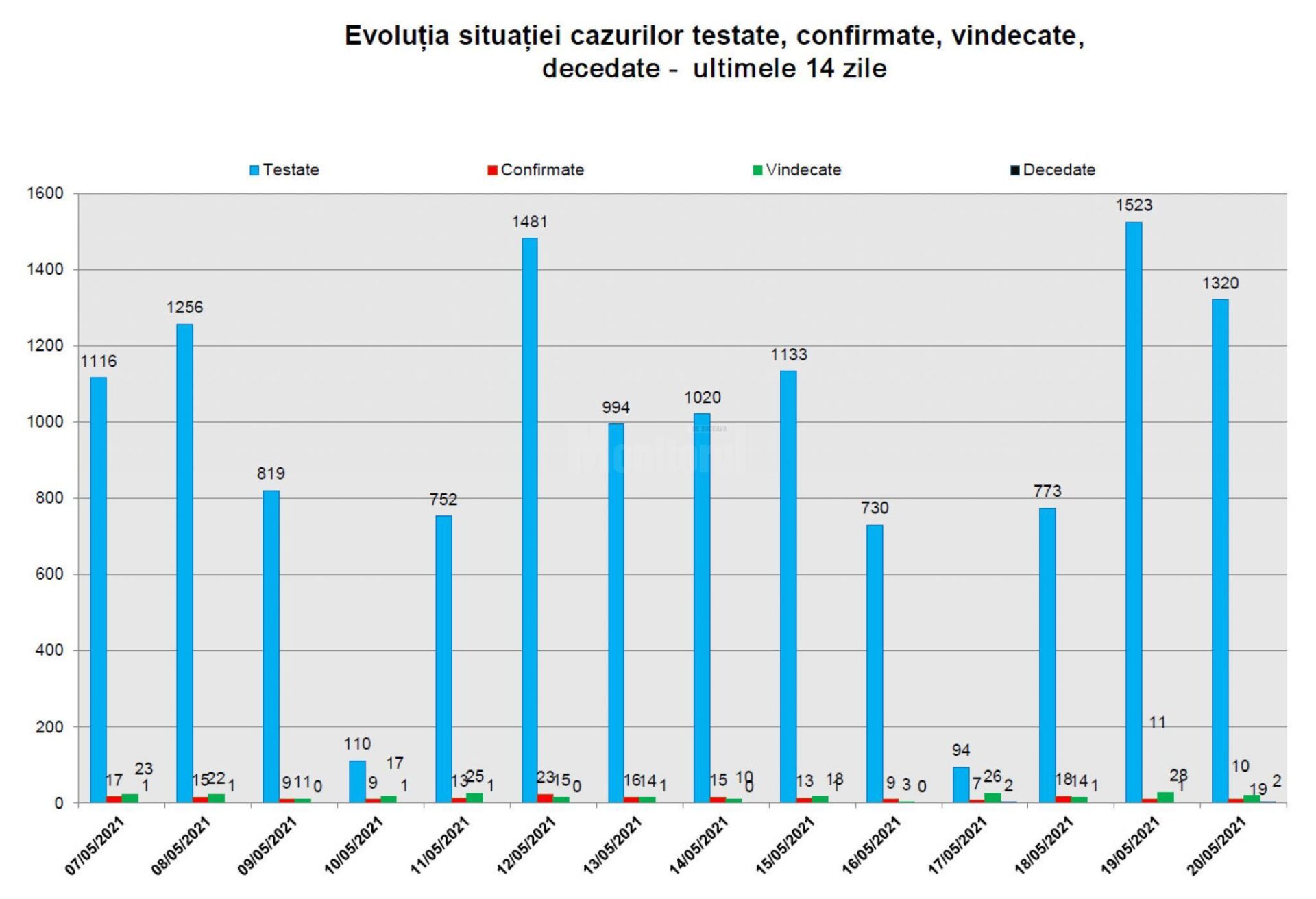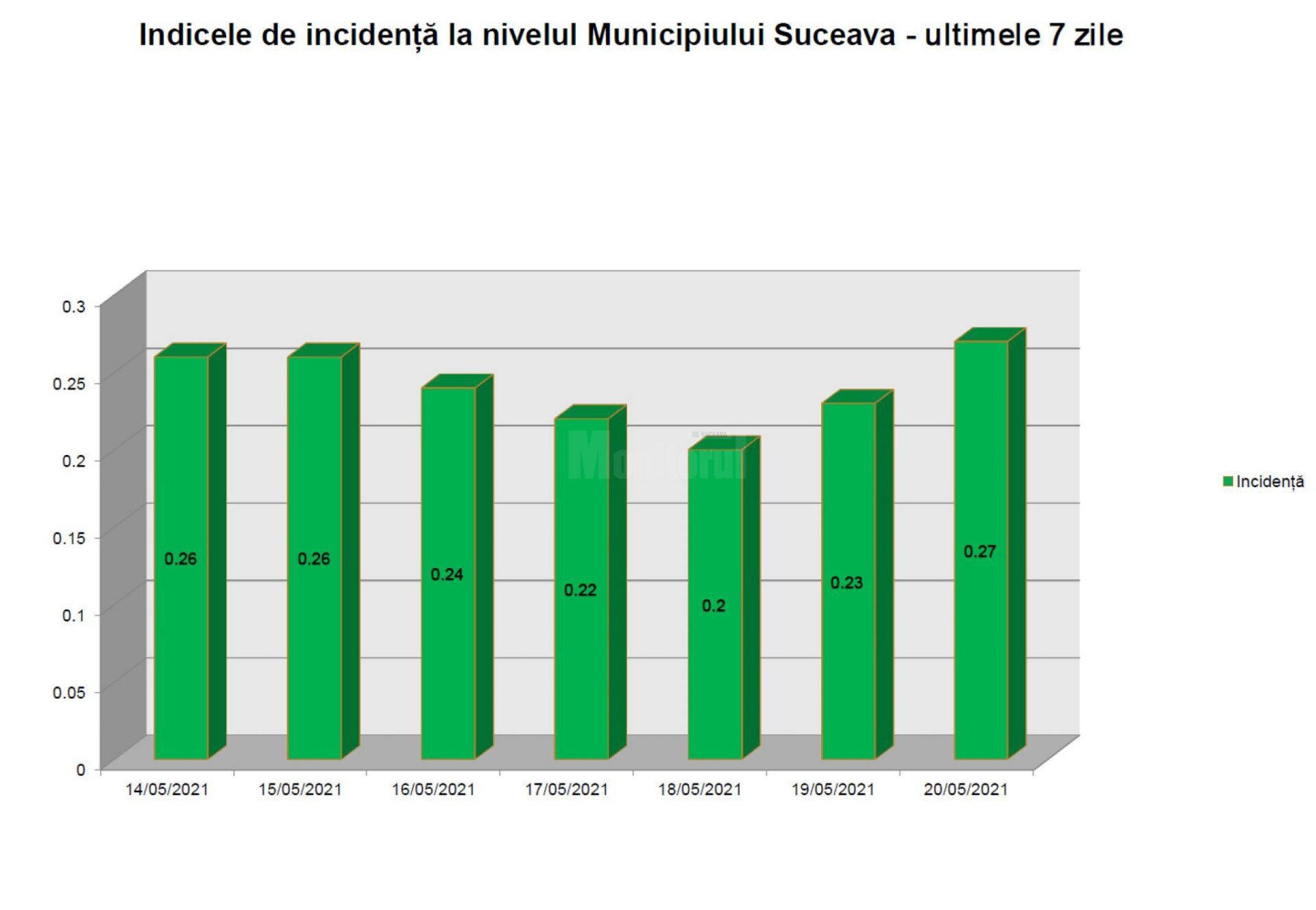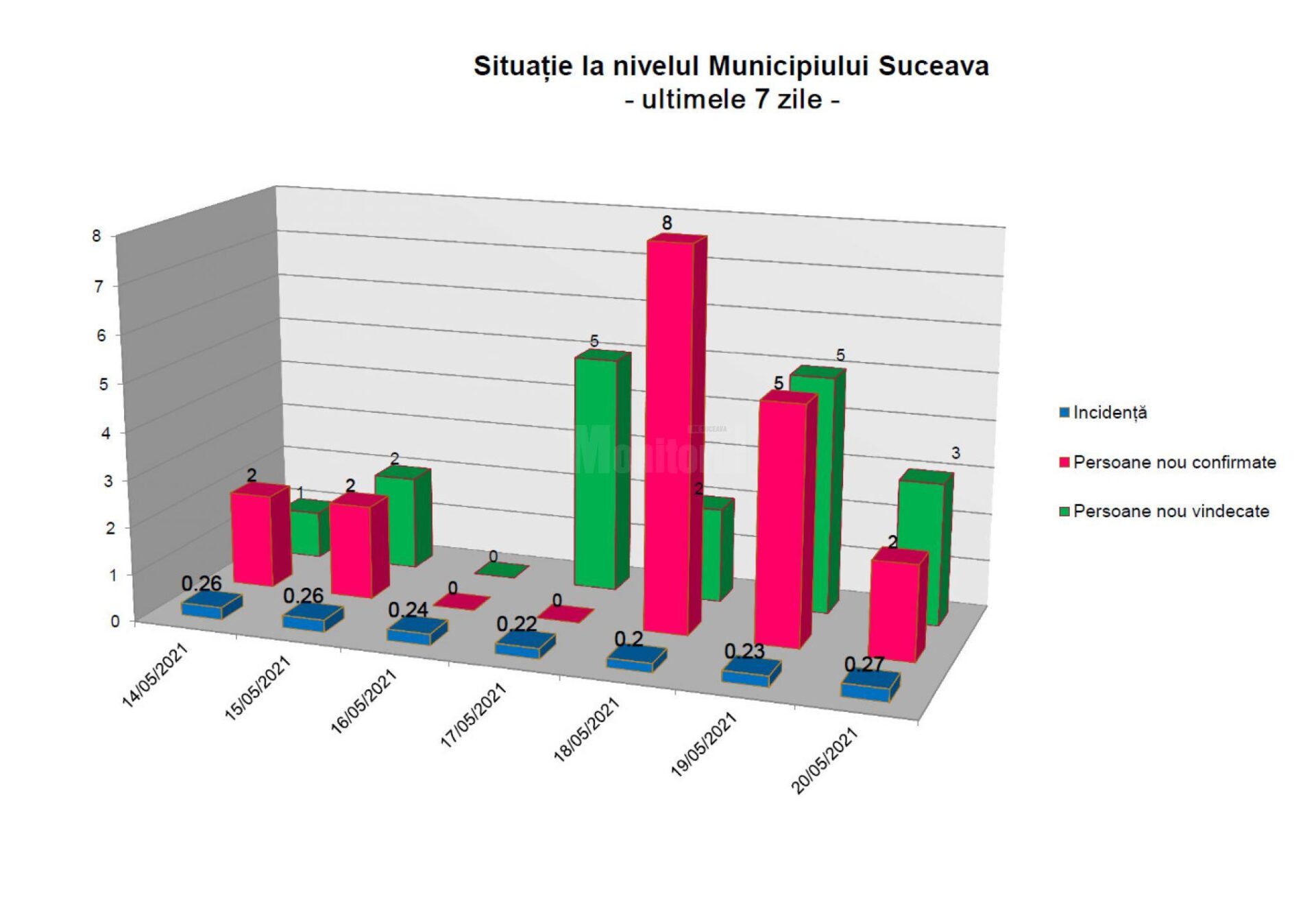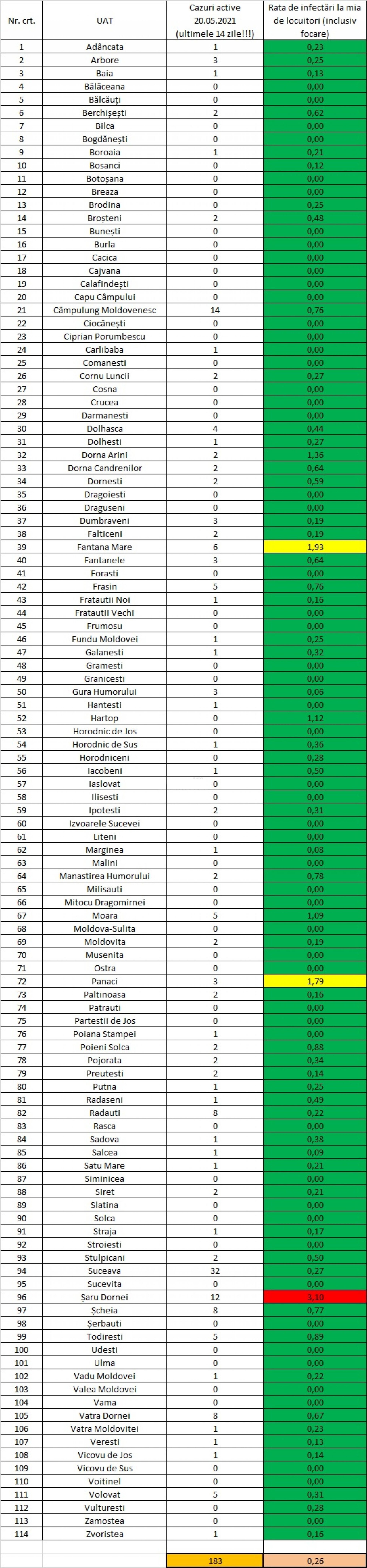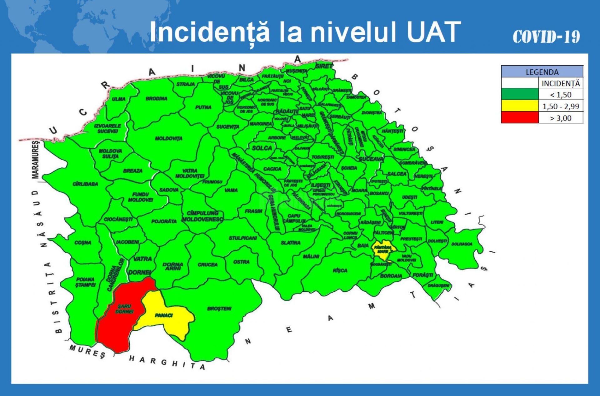 Ca distribuție teritorială a cazurilor active de boală, din cele 114 localități, 57 nu au niciun caz de infecție Covid-19 în evoluție, 24 au câte un caz, 22 au sub cinci cazuri, 8 au sub zece cazuri, iar 3 au peste zece cazuri în evoluție. În total sunt 183 cazuri de infecție Covid -19 în evoluție. În municipiul Suceava incidența a crescut ușor, la 0,27 la mie, cu 32 de cazuri active.