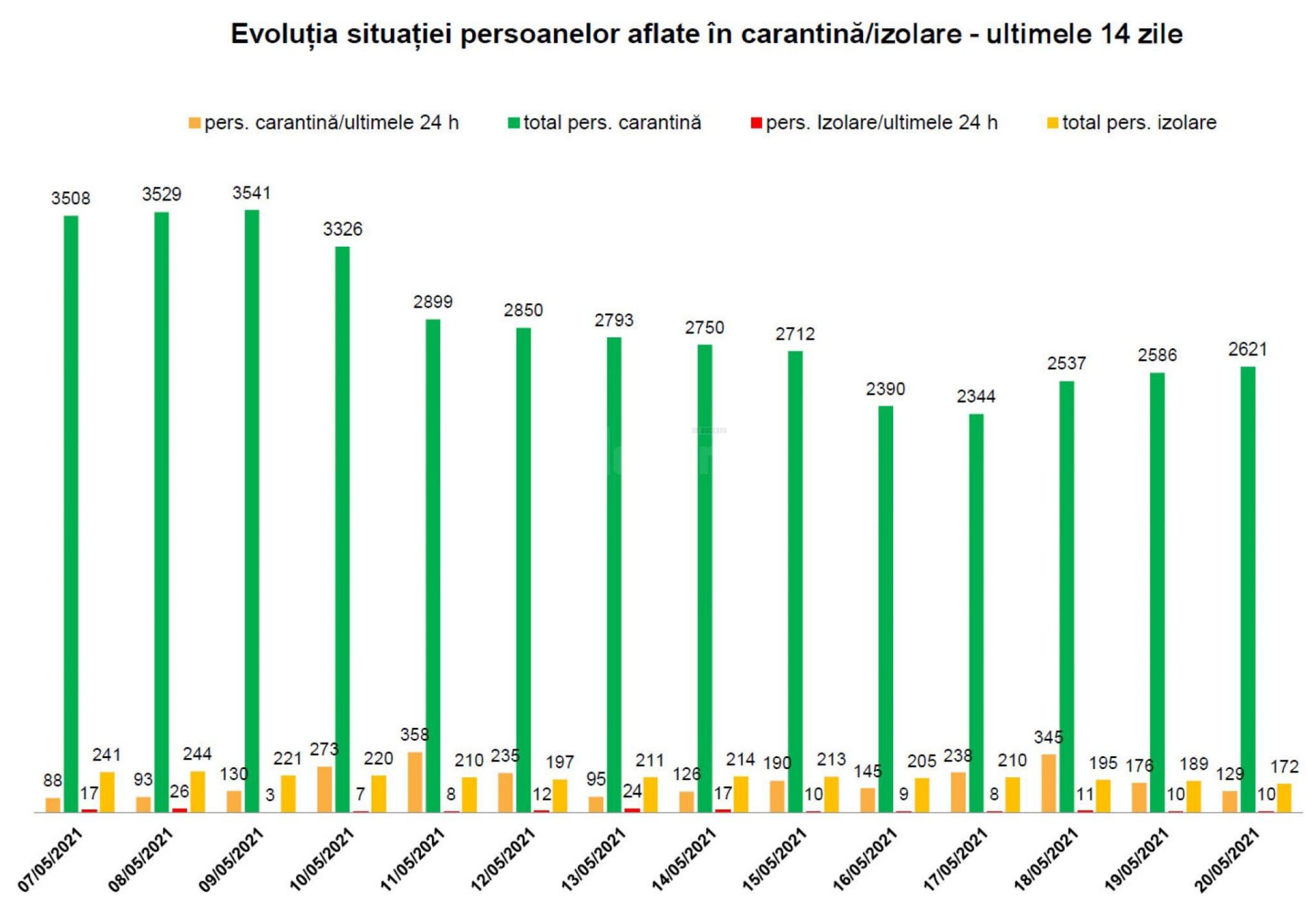 Menționăm că la această dată în izolare se află 172 persoane, din care 10 intrate în ultimele 24 de ore; în carantină sunt 2.621 de persoane. Dintre acestea din urmă, 129 de persoane au intrat în carantină în ultimele 24 de ore, dintre care șapte persoane sunt contacți direcți ai unor oameni confirmați cu SARS-CoV-2.