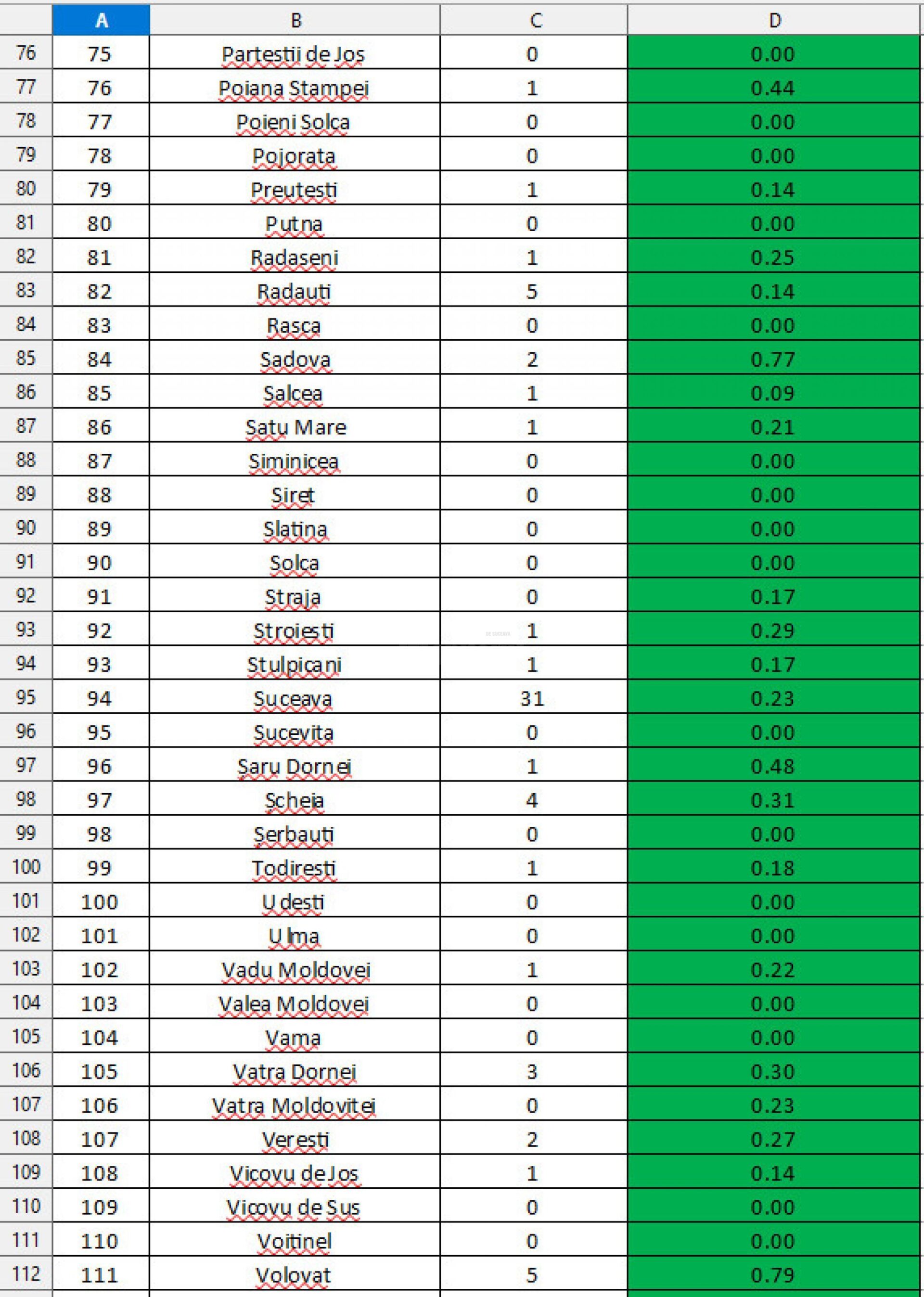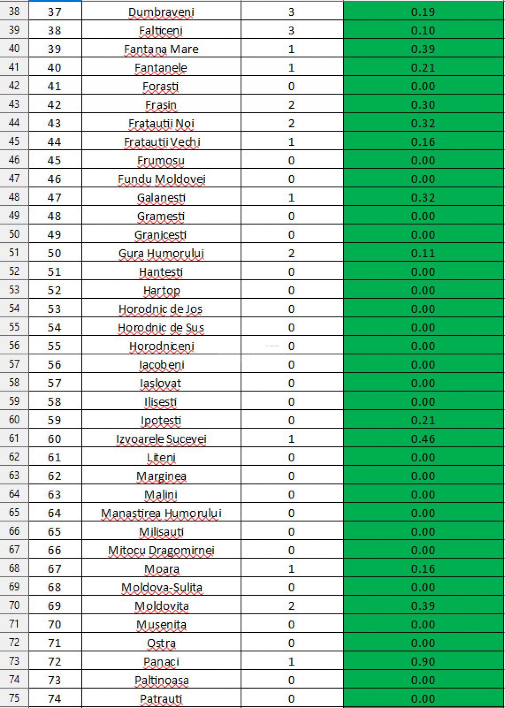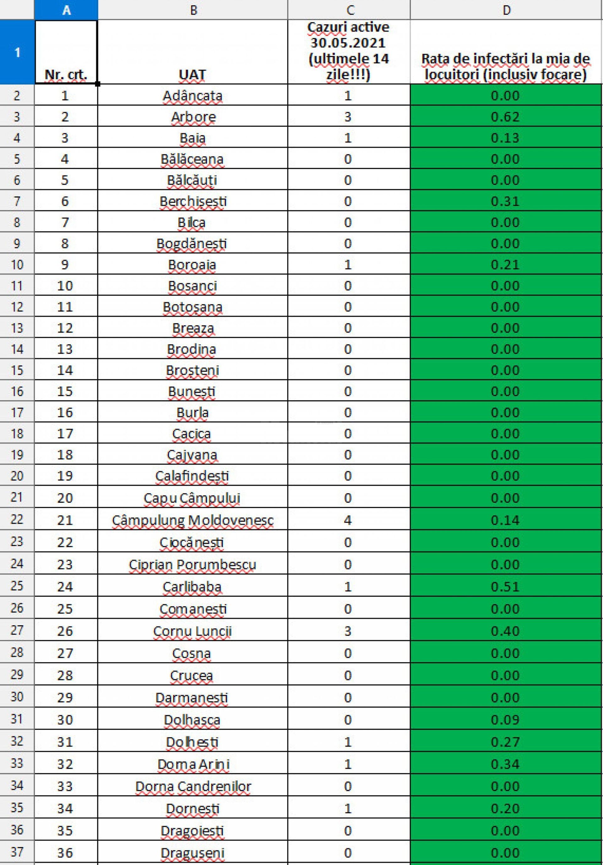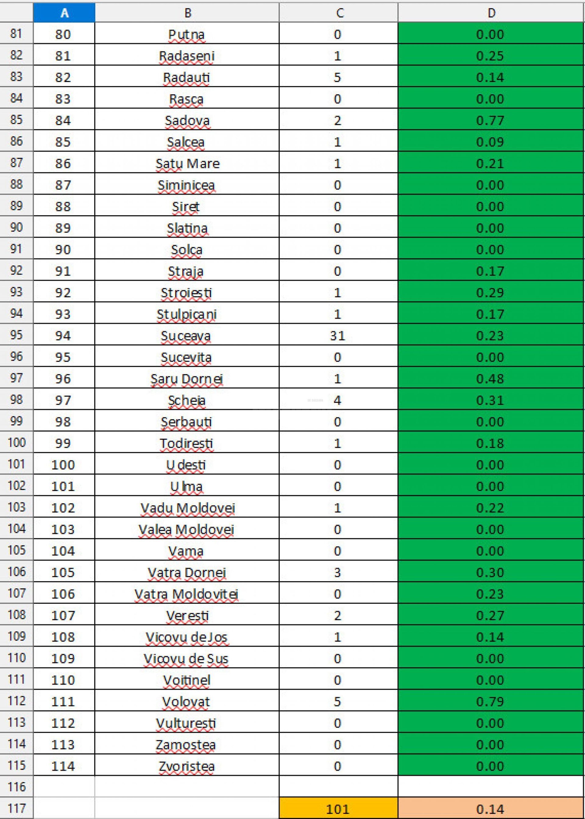 - Rata de infectare este de 0,14 la mia de locuitori iar toate localitățile sunt pe “verde”