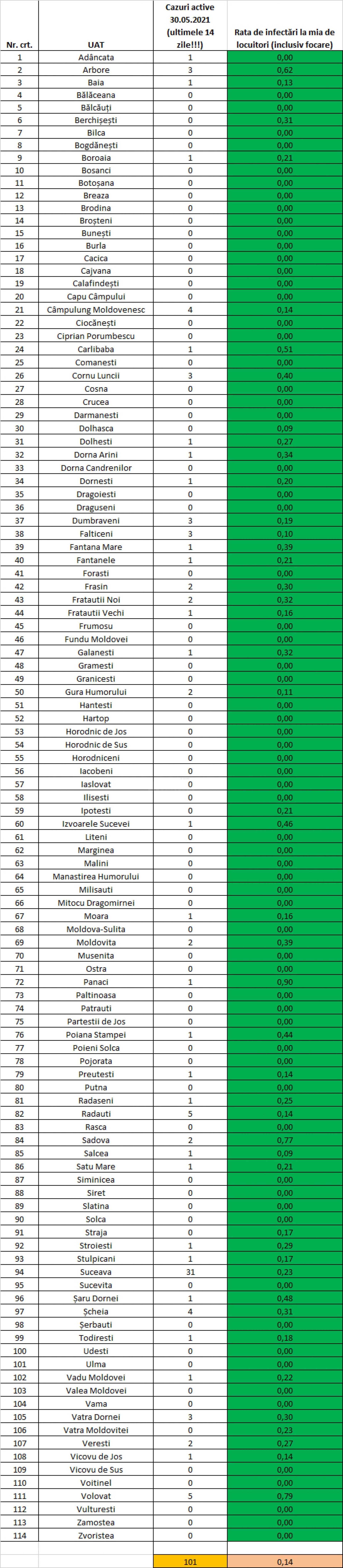 La finele lunii mai, în județul Suceava sunt 101 cazuri de infecție Covid-19 în evoluție, conform statisticilor transmise de către Prefectură.