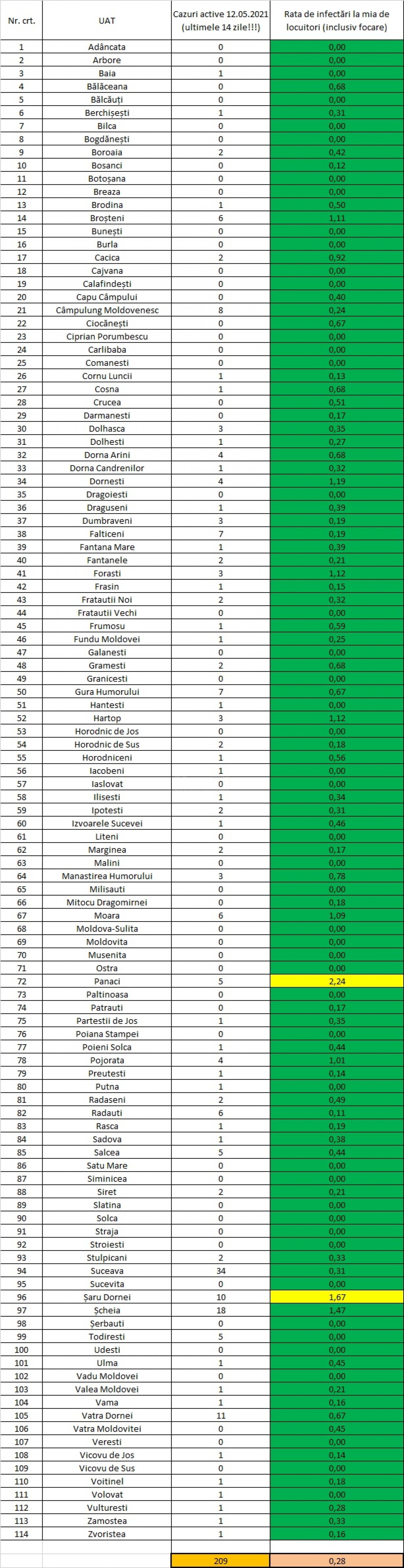 Din cele 114 localități din județ, 50 nu au niciun caz de infecție Covid-19 în evoluție, 32 au câte un caz, 19 au sub cinci cazuri, 9 au sub zece cazuri, iar 4 au peste zece cazuri în evoluție. La această dată în județul Suceava sunt 209 cazuri de infecție Covid -19 în evoluție.