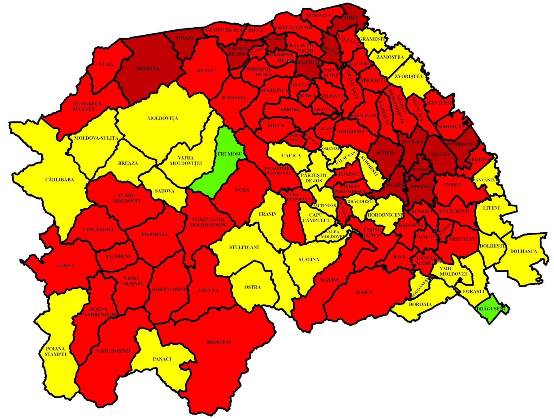 Conform distribuției cazurilor Covid-19 pe unități administrativ-teritoriale, din cele 114 localități, nici una nu are 0 cazuri, una are un caz în evoluție, 8 au sub cinci cazuri în evoluție, 21 au sub zece cazuri în evoluție, iar 84 au peste zece cazuri în evoluție.