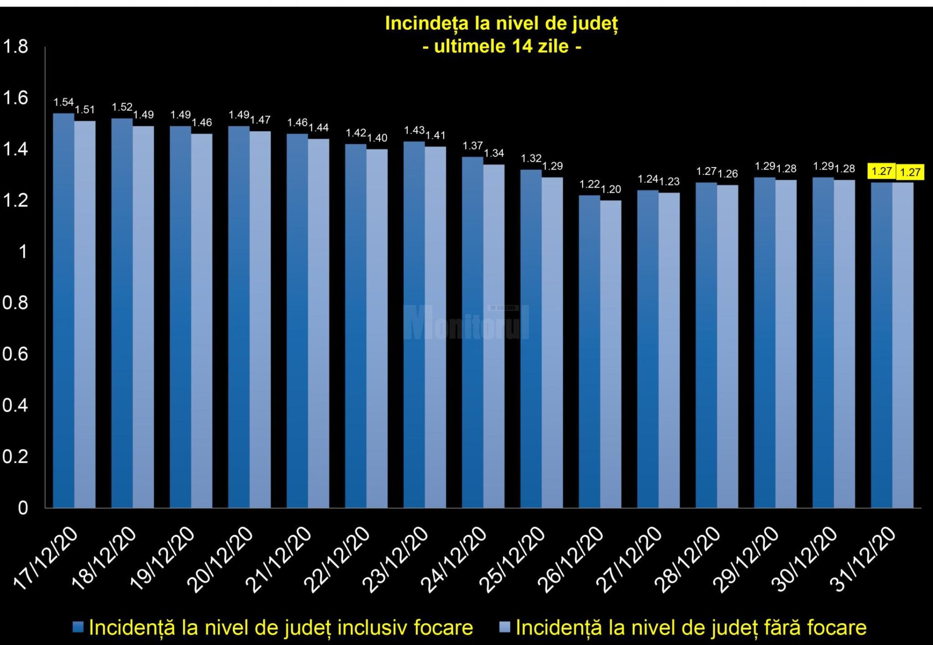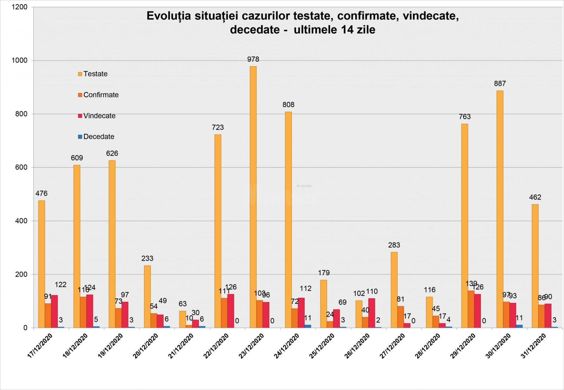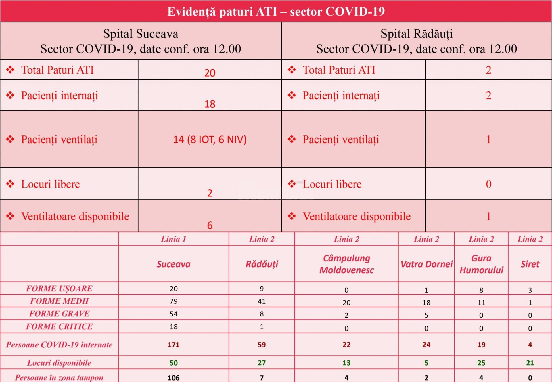 Doar patru localități din județul Suceava – Gura Humorului, Panaci, Ilișești și Pojorâta – mai sunt în zona roșie, cu mai mult de 3 cazuri de Covid-19 la mia de locuitori. Municipiul Suceava este în zona galbenă, cu 1,94 la mie incidență și 13 cazuri noi confirmate în data de 31 decembrie.