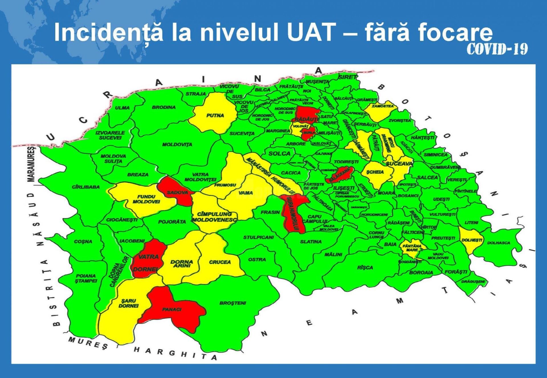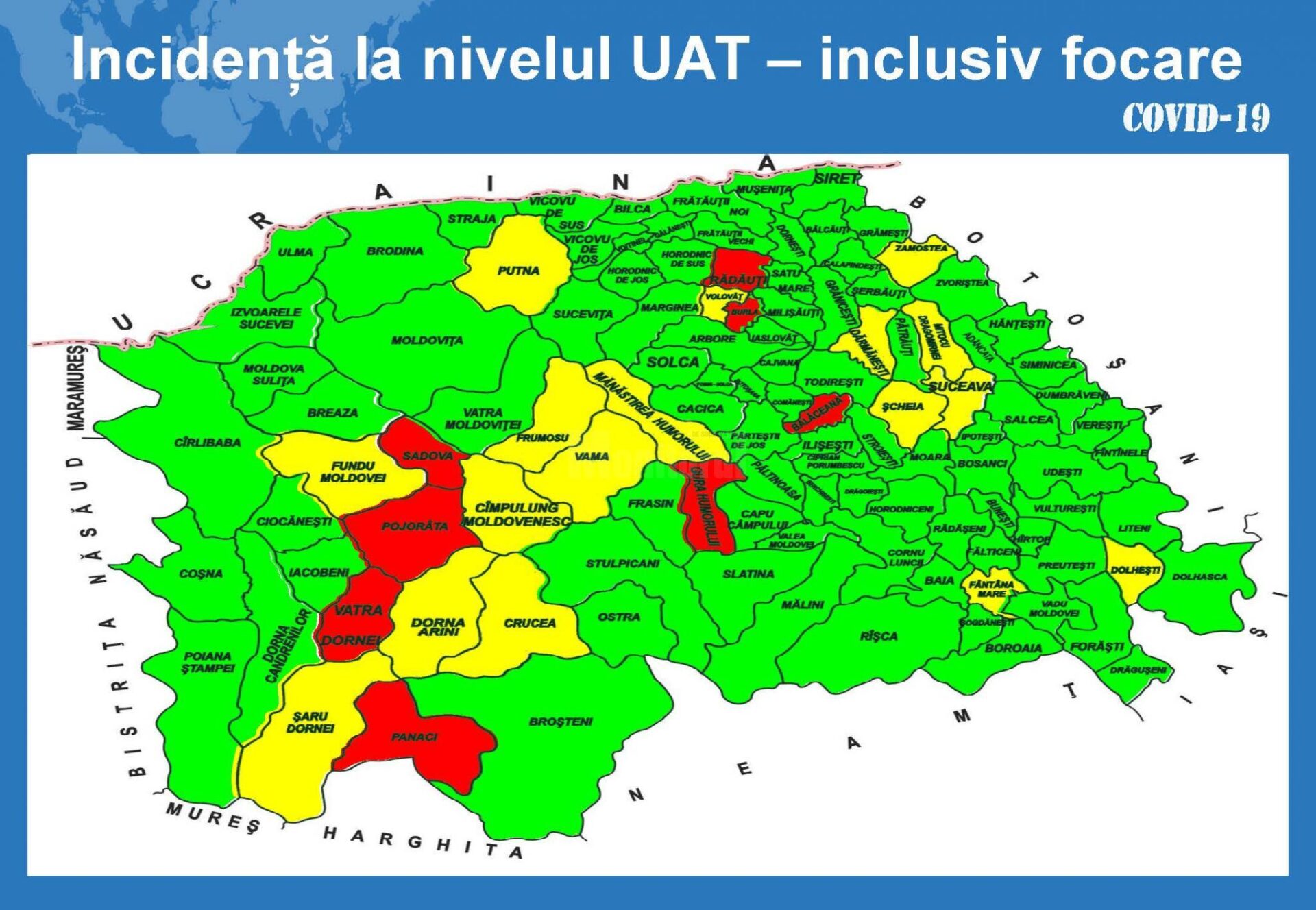Județul Suceava avea înregistrate, duminică, 1.163 cazuri de infecție Covid -19 în evoluție. Din cele 114 unități administrativ-teritoriale din județ, 13 nu au niciun caz de infecție Covid-19 în evoluție, 17 au câte un caz, 36 au sub cinci cazuri, 29 au sub zece cazuri, iar 19 au peste zece cazuri în evoluție. În scenariul roșu, cu incidență de peste 3 cazuri pozitive la mia de locuitori sunt 8 localități: Bălăceana – 5,40 la mie, Burla – 4,31 la mie, Gura Humorului – 3,26 la mie, Panaci – 3,58 la mie, Pojorâta – 3,02 la mie (cu focare), Rădăuți – 3,27 la mie, Sadova – 3,06 la mie, Vatra Dornei – 4,11 (cu focare). Alte 17 localități sunt în scenariul galben, inclusiv municipiul Suceava, cu o incidență de 2,48 la mie. Celelalte 89 de localități sunt în scenariul verde, cu incidență sub pragul de 1,5 la mie. În județ sunt două focare în evoluție, la Centrul Social de Primire, Asistare și Îngrijire a Persoanelor Vârstnice Vatra Dornei – 11 cazuri și la CRRN Pojorâta – 8 cazuri.