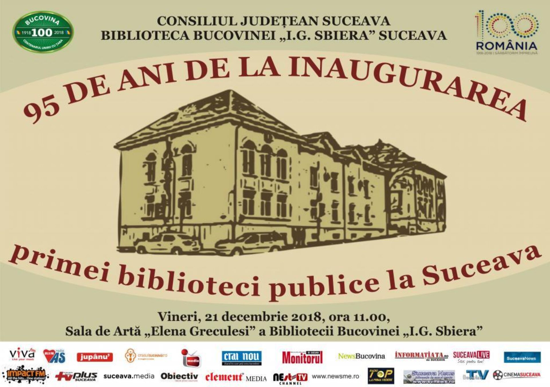 Biblioteca Bucovinei „I.G. Sbiera” Suceava aniversează 95 de ani de la inaugurarea primei biblioteci publice la Suceava. Evenimentul va avea loc vineri, 21 decembrie, de la ora 11.00, în sala de Artă „Elena Greculesi”.