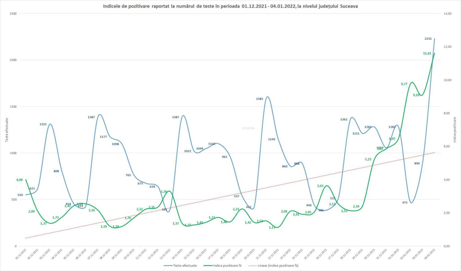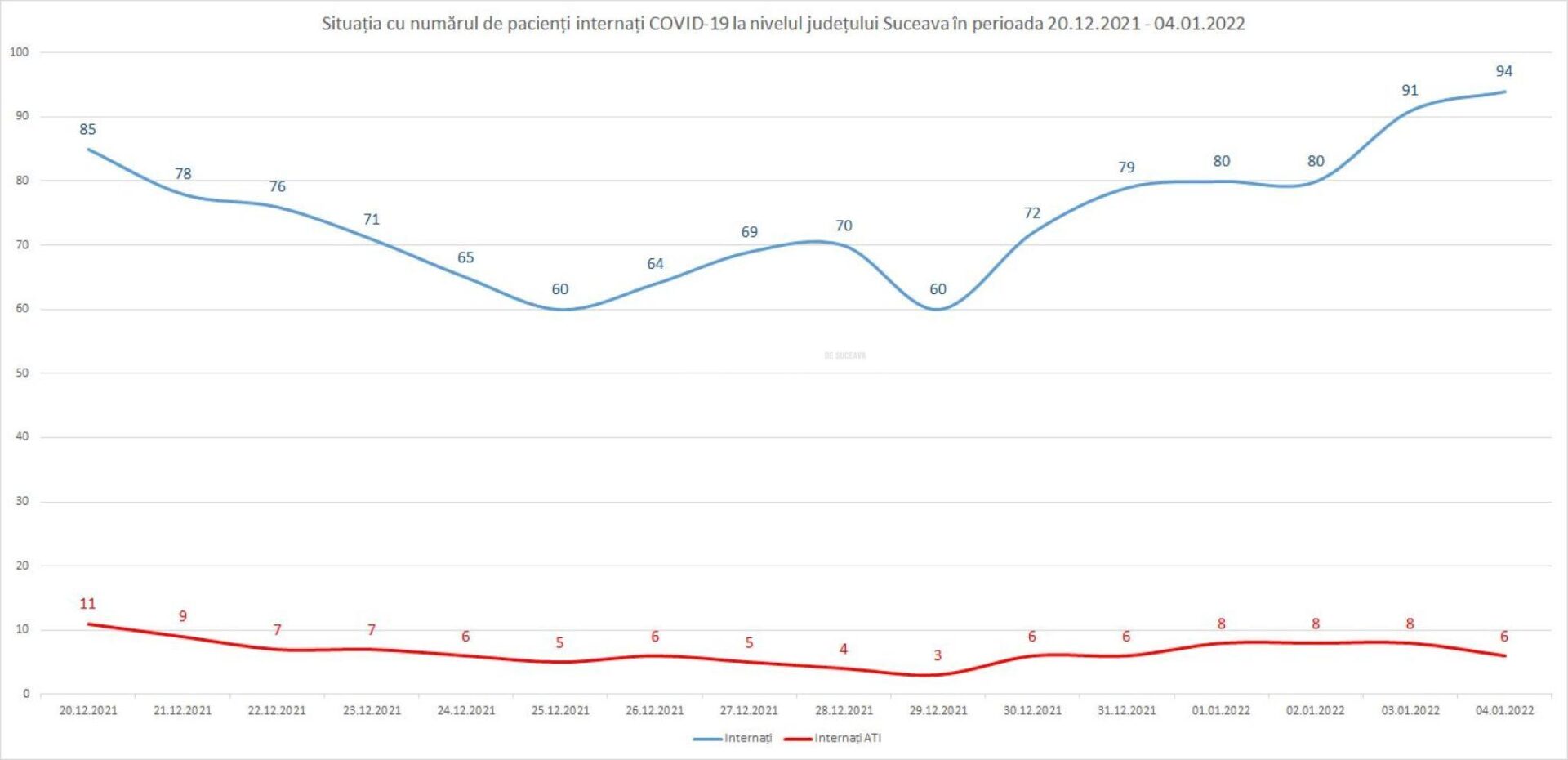 În spitalele din județ sunt internate 94 de persoane diagnosticate cu Covid-19 și 37 de persoane suspecte de boală. În intervalul 3-4 ianuarie au fost internate 21 de persoane cu Covid și au fost externate 23 persoane cu această afecțiune. În aceeași perioadă de referință a decedat o persoană ca urmare a infecției Covid.