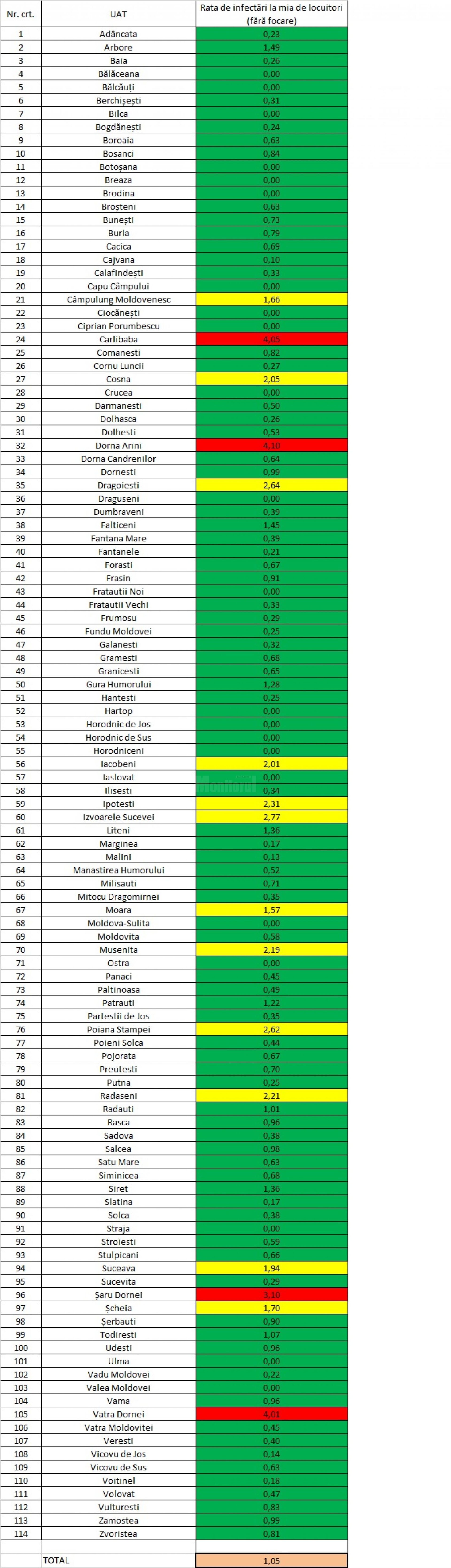 Conform distribuției cazurilor Covid-19 pe unități administrativ-teritoriale, din cele 114 localități, 22 nu au niciun caz de infecție Covid-19 în evoluție, 24 au câte un caz, 37 au sub cinci cazuri, 15 au sub zece cazuri, iar 16 au peste zece cazuri în evoluție. La această dată în județ sunt 817 cazuri de infecție Covid -19 în evoluție, față de 808 în ziua precedentă. În zona roșie sunt patru localități – Cârlibaba, cu incidența cazurilor pozitive de 4,05 la mia de locuitori, Dorna Arini – cu 4,10 la mie, Șaru Dornei- 3,10 la mie și municipiul Vatra Dornei, cu 4,01 la mie. În municipiul Suceava incidența este de 1,94 la mie, la fel ca în ziua precedentă.