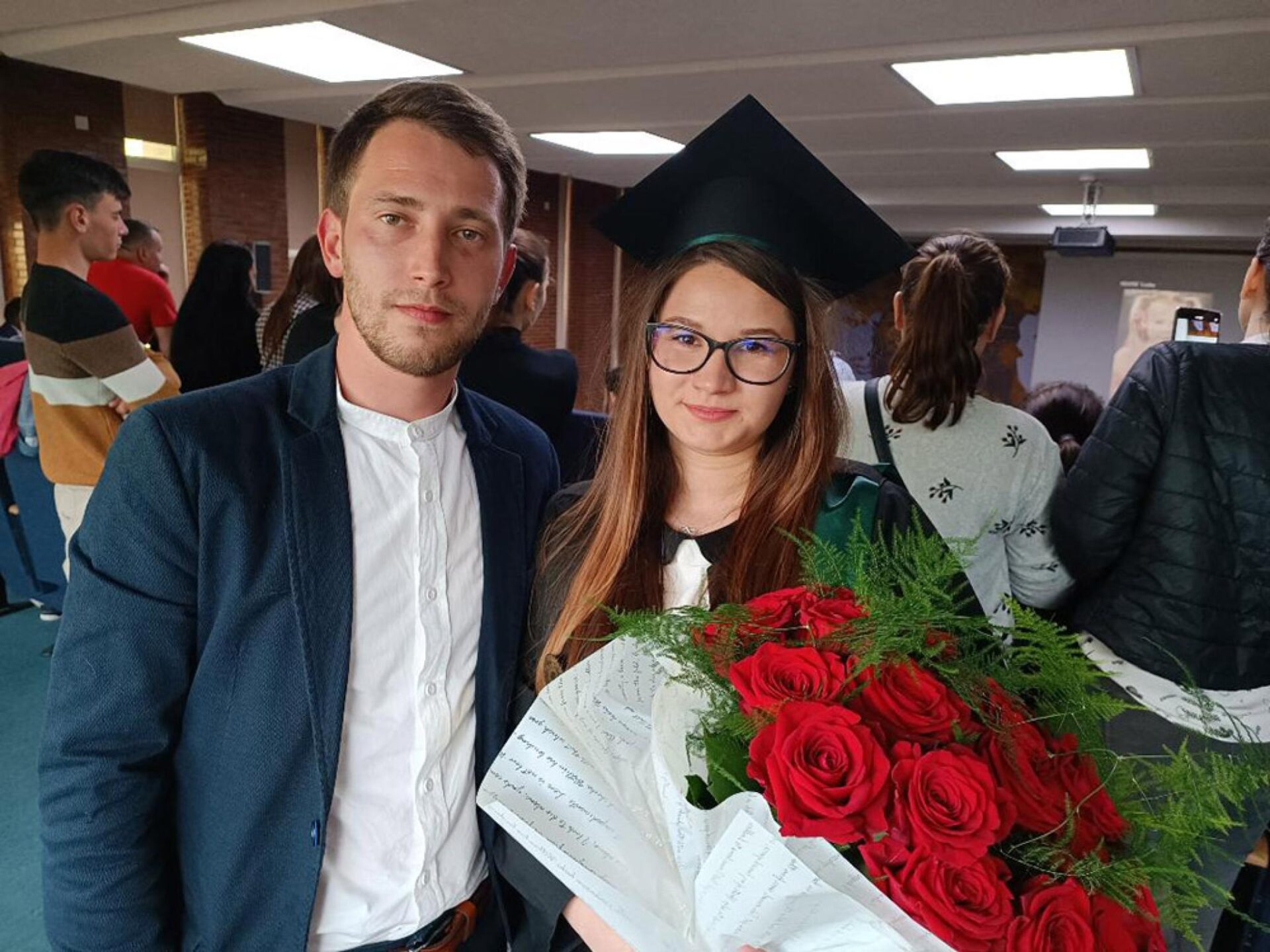 Roxana Aiftincăi și Răzvan Roșu sunt împreună de 4 ani, iar Răzvan s-a gândit că momentul absolvirii ar fi cel mai potrivit pentru o cerere în căsătorie. A organizat totul cu câțiva complici și a surprins-o plăcut pe prietena sa, care a fost emoționată până la lacrimi de inițiativa iubitului ei. Colegii, prietenii și profesorii i-au felicitat și le-au urat ”Casă de piatră”.