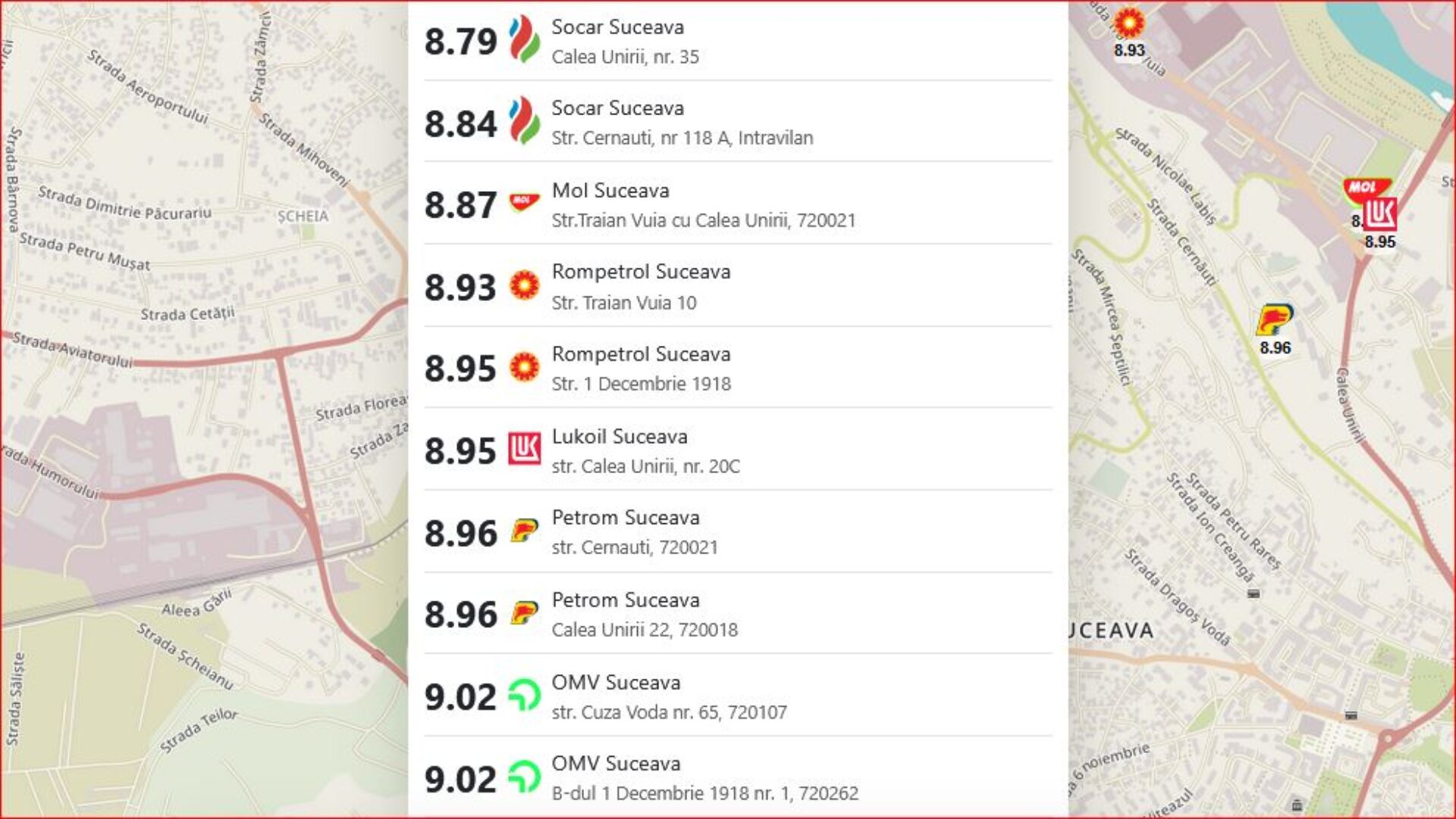 Așa se face că în dimineața zilei de 20 martie, benzina se vindea cu prețuri cuprinse între 8,79-9,02 lei/litru, cel mai ridicat preț fiind la benzinăriile OMV.