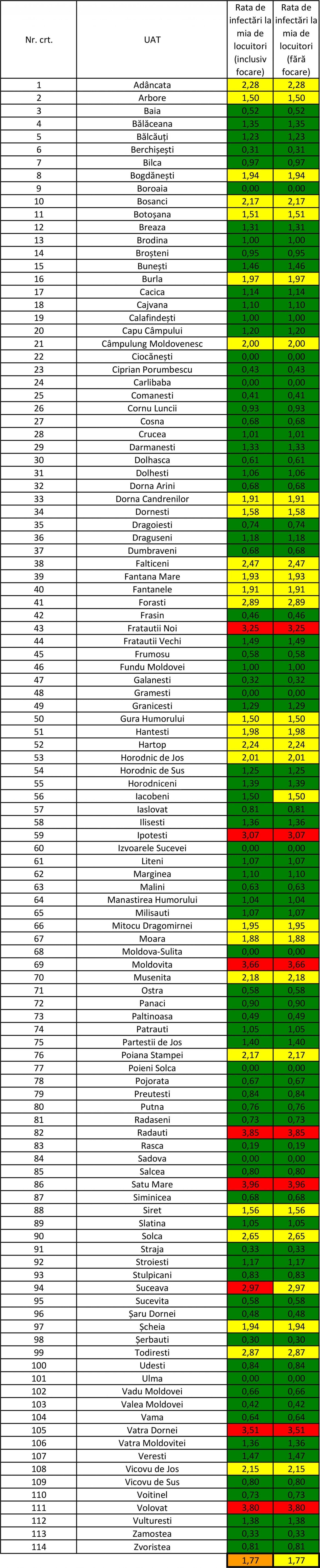 Numărul cazurilor de Covid -19 în evoluție pe raza județului Suceava a scăzut, vineri, la 1.377, de la 1.437 de cazuri, câte au fost joi, și a crescut concomitent numărul localităților în care nu este nici un caz activ, la această dată. Conform distribuției cazurilor Covid-19 pe unități administrativ-teritoriale, din cele 114 localități, 9 nu au niciun caz de infecție Covid-19 în evoluție, 8 au câte un caz, 39 au sub cinci cazuri, 32 au sub zece cazuri, iar 26 au peste zece cazuri în evoluție. În municipiul Suceava incidența cazurilor active crește pas cu pas, de la 2,96 la mie joi, la 2,97 la mie, vineri.