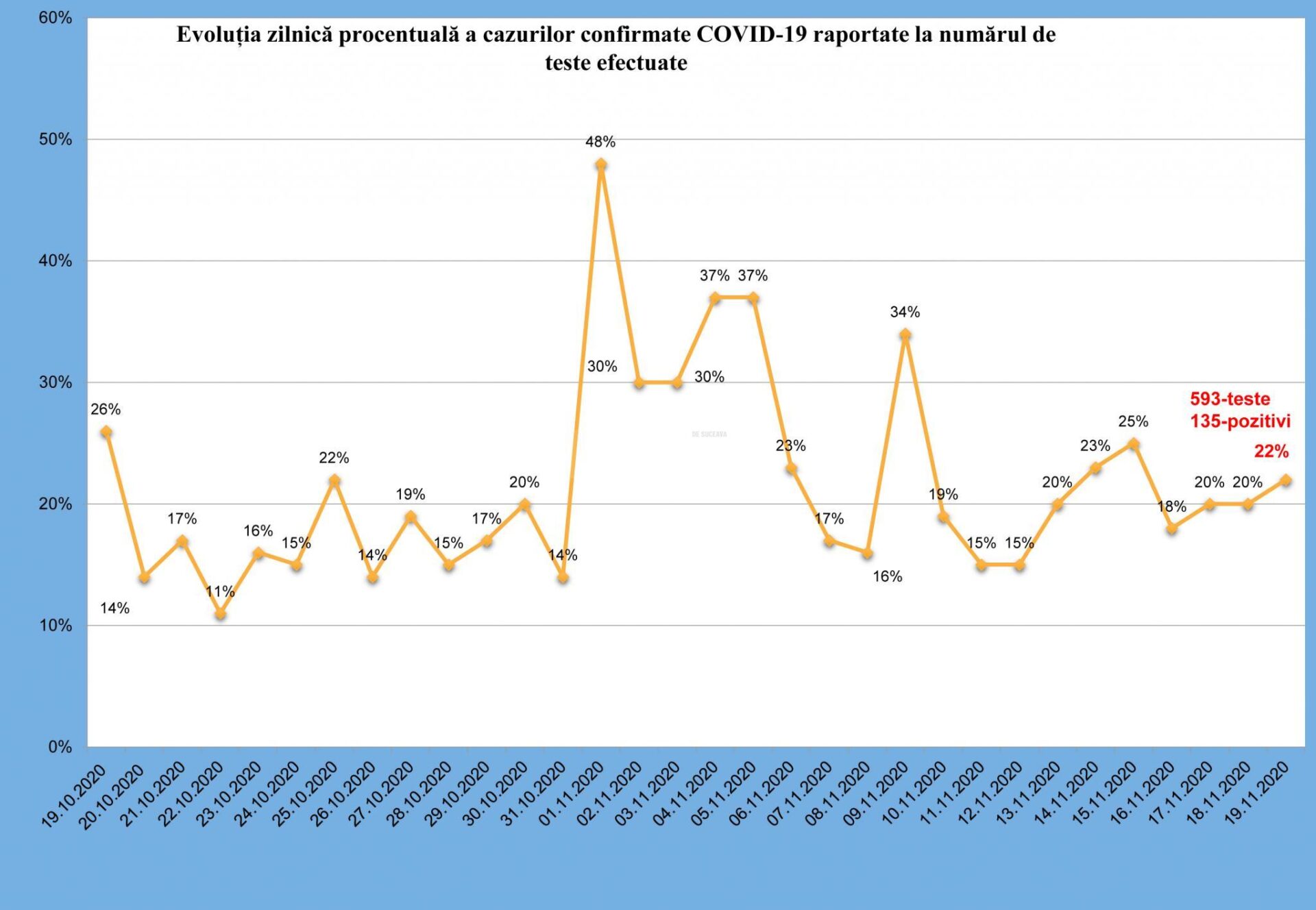 În intervalul 18-19 noiembrie, orele 10.00, au fost raportate 167 de decese, dintre care 160 sunt ale unor pacienți care au prezentat comorbidități. Numărul total de decese înregistrat până la această dată, la nivel național, este de 9.596. În unitățile sanitare de profil, numărul total de persoane internate cu Covid-19 este de 13.447. Dintre acestea, 1.131 sunt internate la ATI.