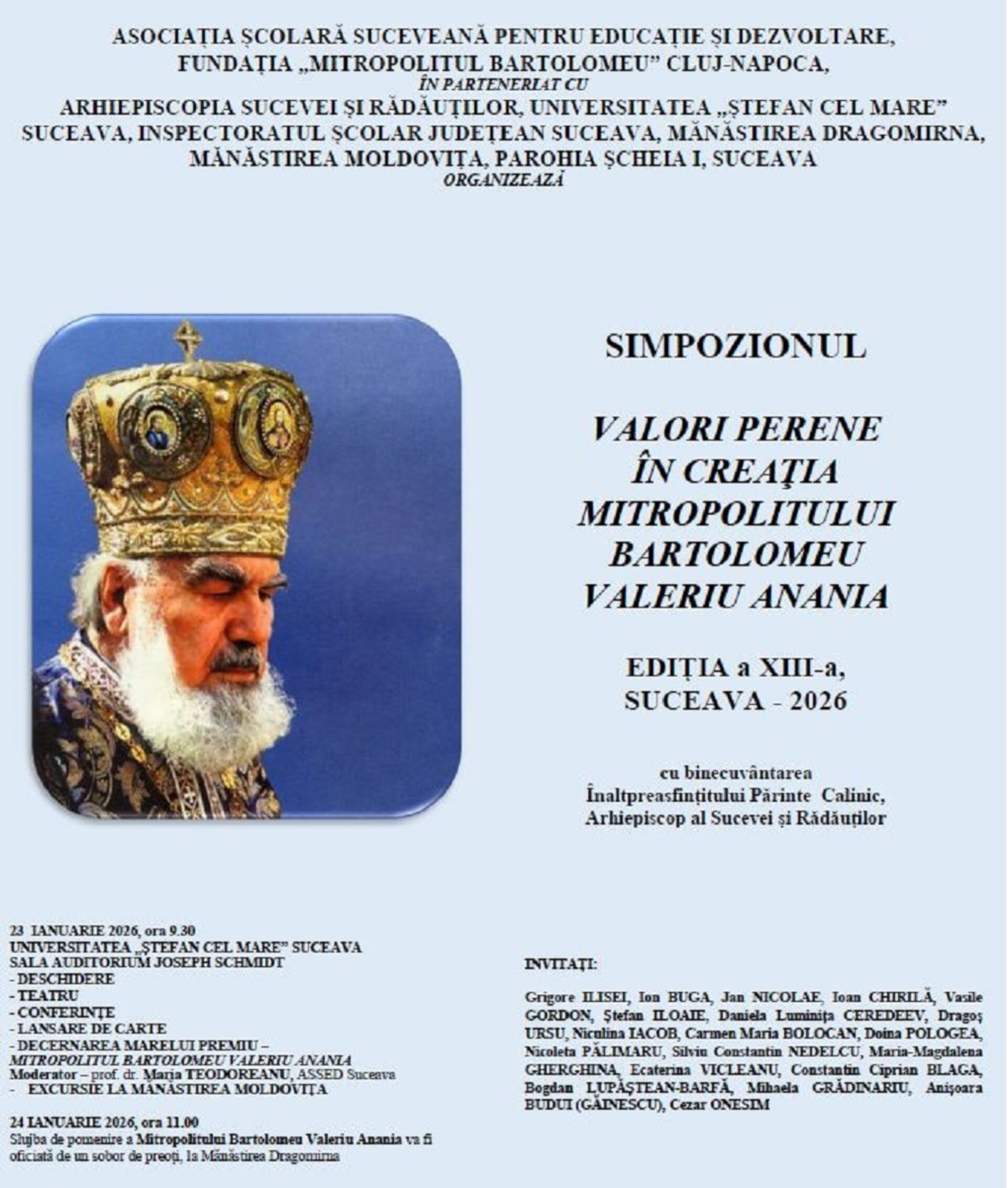 Ajuns la cea de a XIII-a ediție și beneficiind de binecuvântarea Înaltpreasfințitului Părinte Calinic, Arhiepiscop al Sucevei și Rădăuților, simpozionul „Valori perene în creația Mitropolitului Bartolomeu Valeriu Anania” se va derula în cursul zilei de vineri, 23 ianuarie, începând cu ora 09.30, în cadrul Sălii Auditorium Joseph Schmidt din Universitatea „Ștefan cel Mare” din Suceava. Evenimentul este organizat de către Asociația Școlară Suceveană pentru Educație și Dezvoltare (ASSED) și Fundația „Mitropolitul Bartolomeu” Cluj-Napoca, în parteneriat cu Arhiepiscopia Sucevei și Rădăuților, Universitatea „Ștefan cel Mare” Suceava, Inspectoratul Școlar județean Suceava, Mănăstirea Dragomirna, Mănăstirea Moldovița și Parohia Șcheia I, Suceava.