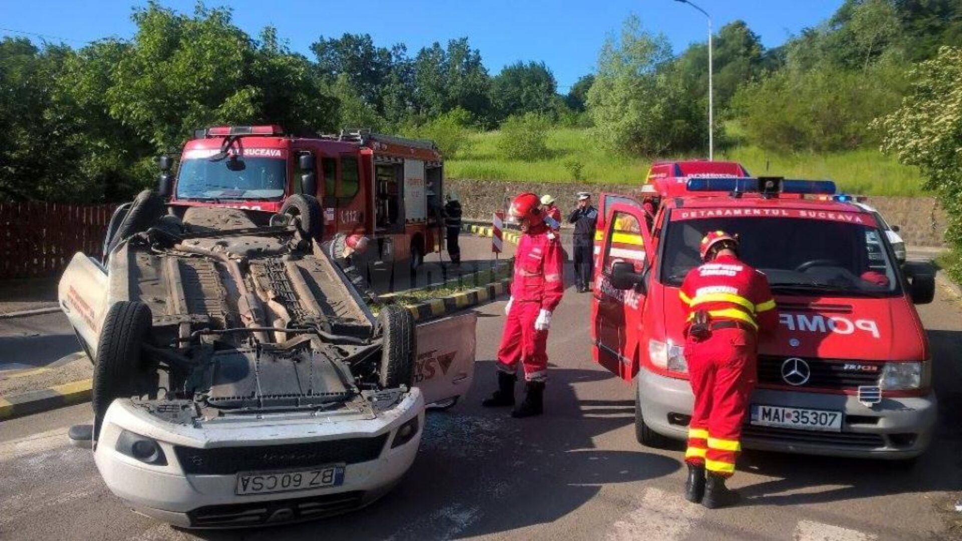 Detașamentul de pompieri Suceava, deplasat la fața locului cu echipaj de Descarcerare și două ambulanțe, una tip B și una tip C, de Terapie Intensivă, a găsit trei victime, din care una, din mașina răsturnată, încarcerată.