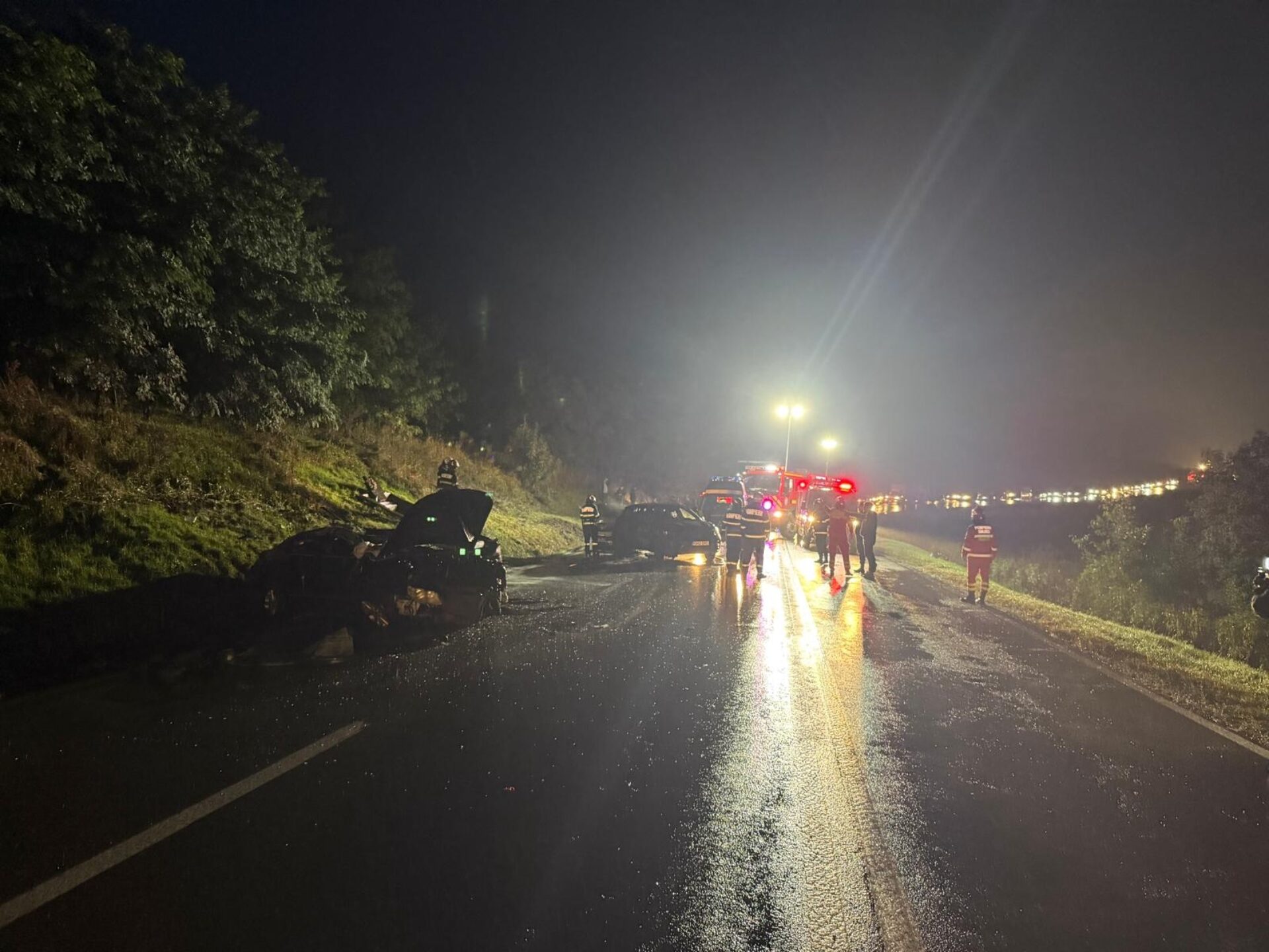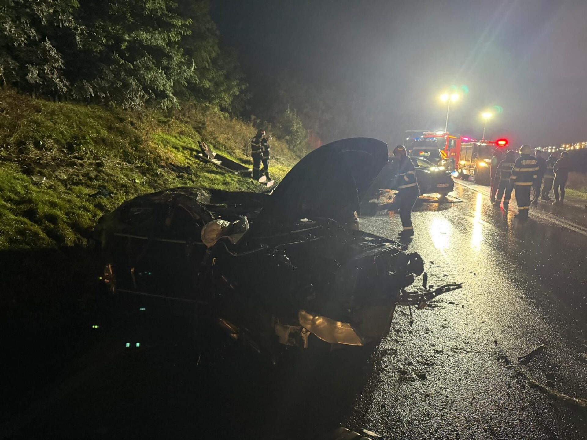 Una dintre mașini a luat foc, incendiul fiind stins de alți șoferi participanți la trafic, până la sosirea pompierilor.