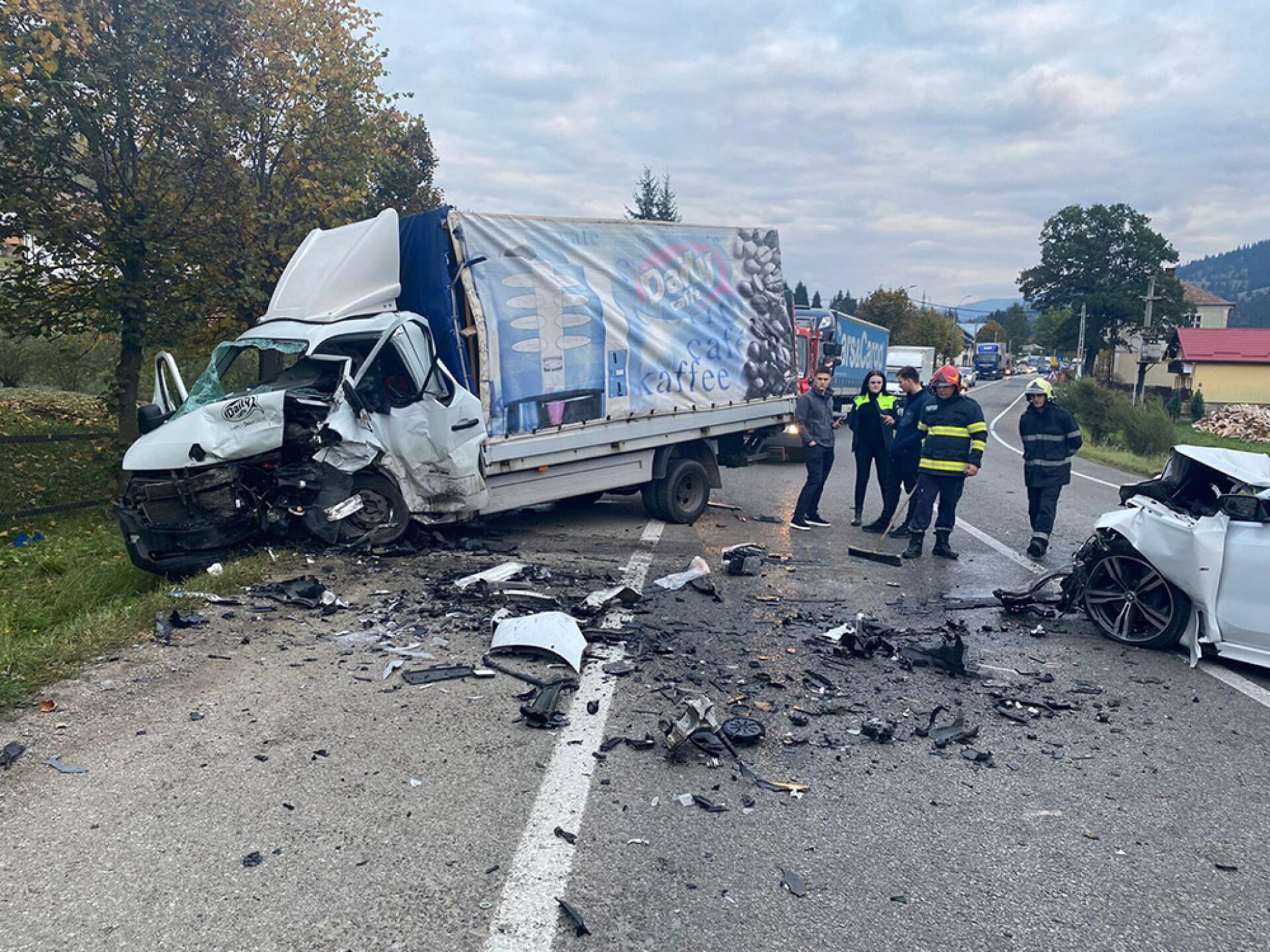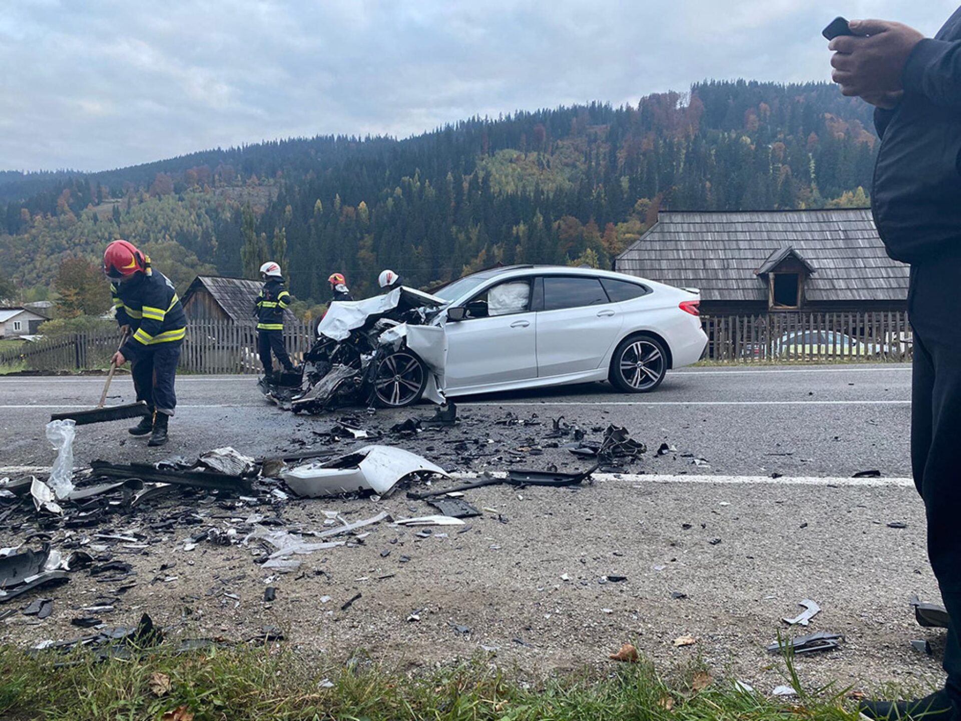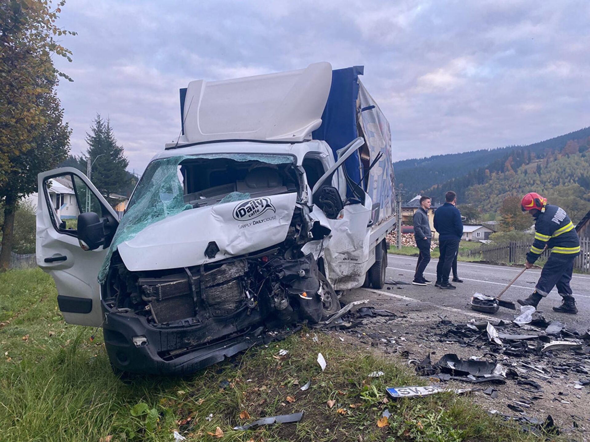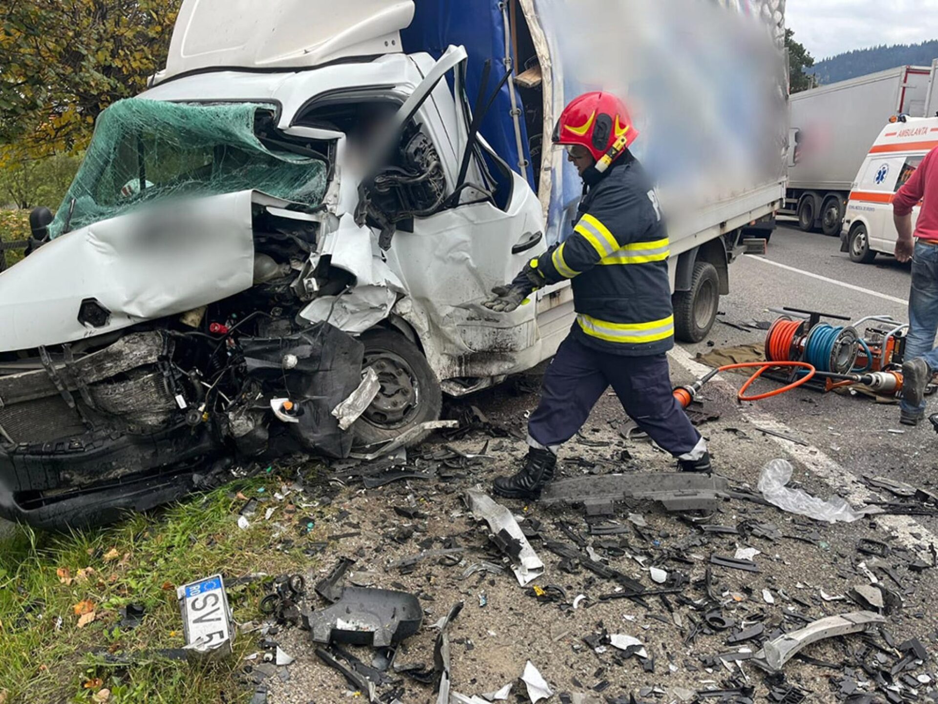 Un autoturism și o autoutilitară au fost implicate într-un accident rutier extrem de violent care s-a petrecut vineri după-amiază în zona Argestru din municipiul Vatra Dornei. După cum se vede și în imagini, un autoturism s-a zdrobit de o autoutilitară care venea din sens opus, ambele mașini având avarii majore în urma accidentului. Pompierii militari de la Vatra Dornei deplasați la fața locului cu echipaj de descarcerare au constatat că în accident au fost implicate patru persoane, din care două erau încarcerate. Toate cele patru persoane au fost transportate la spital, fiind conștiente și cooperante, dar având multiple traumatisme.