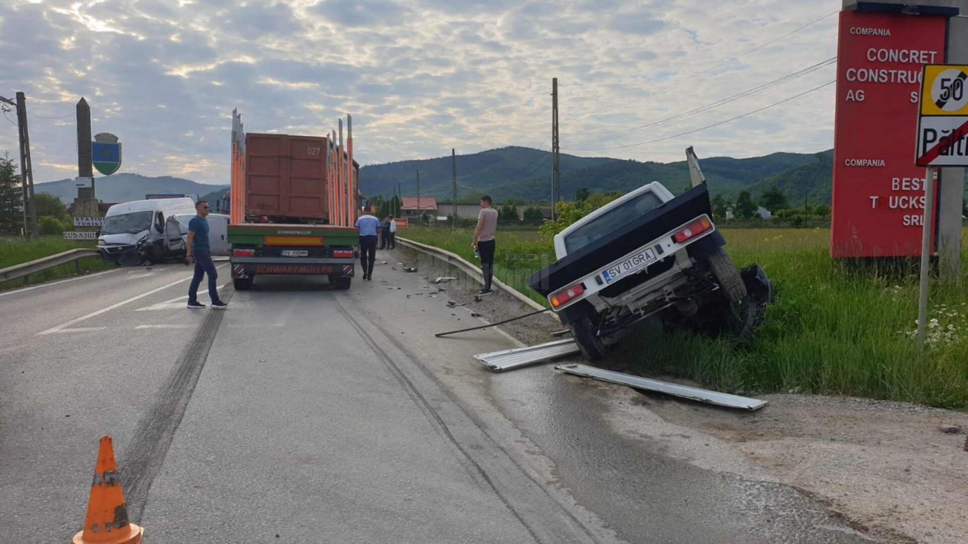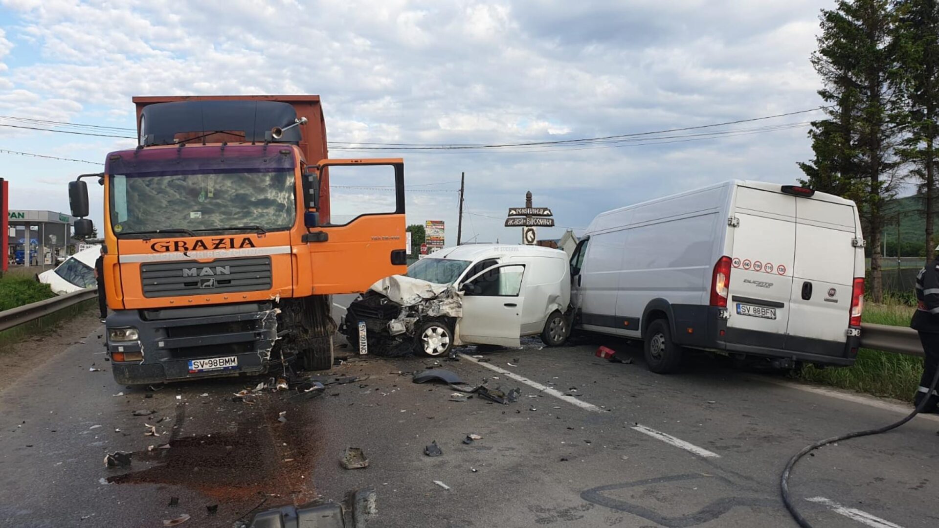 Un accident rutier grav, în care au fost implicate 4 autovehicule (un camion și trei autoutilitare), a avut loc vineri după-amiază la intrarea în Gura Humorului dinspre Păltinoasa.