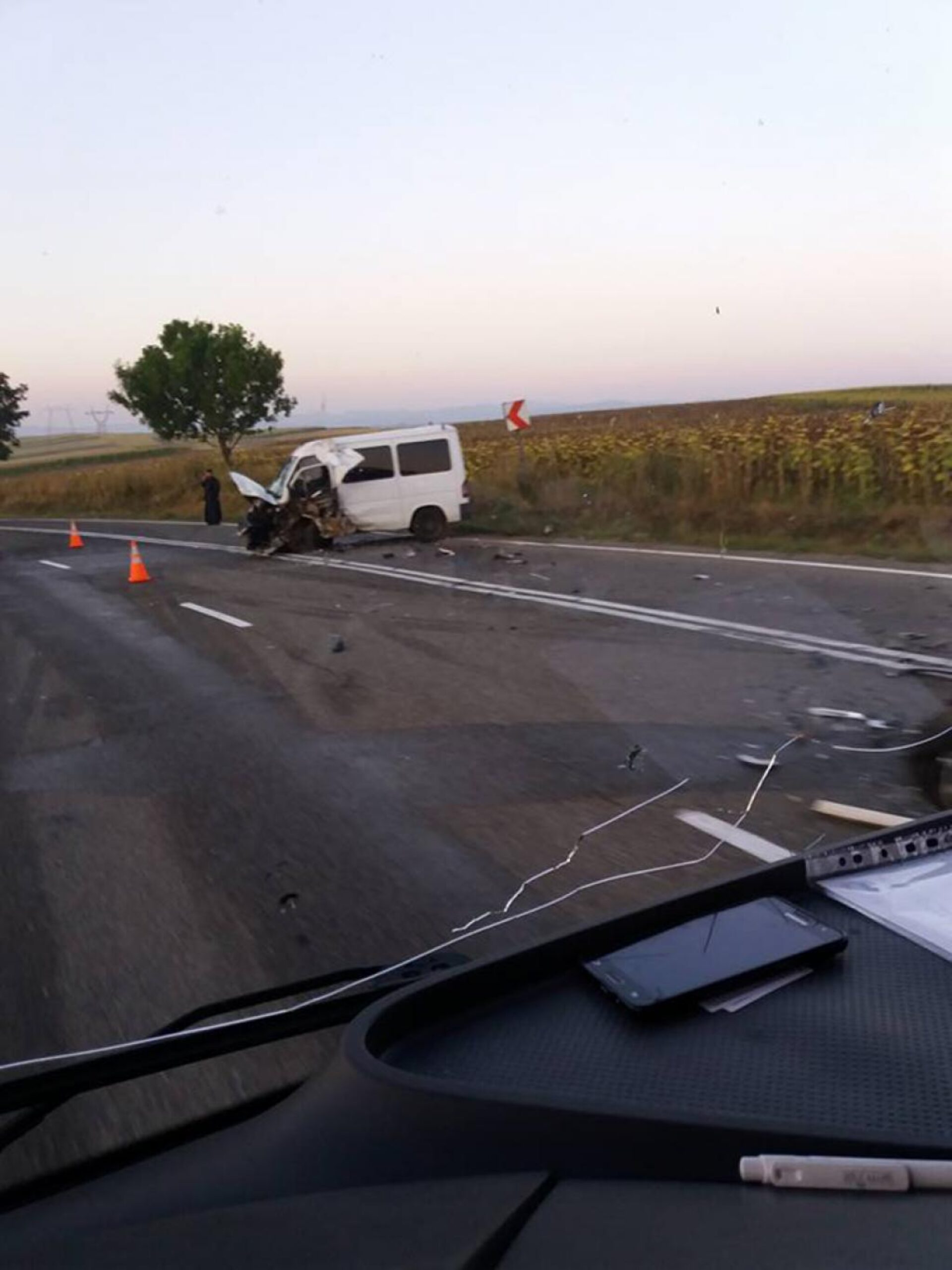 Un bărbat care conducea un autoturism Peugeot și care se pare că se întorcea de la mare a ațipit la volan și a pătruns cu mașina pe contrasens, de unde venea microbuzul. La volanul microbuzului era un preot de la Mănăstirea Sf. Ioan, care se deplasa regulamentar.
