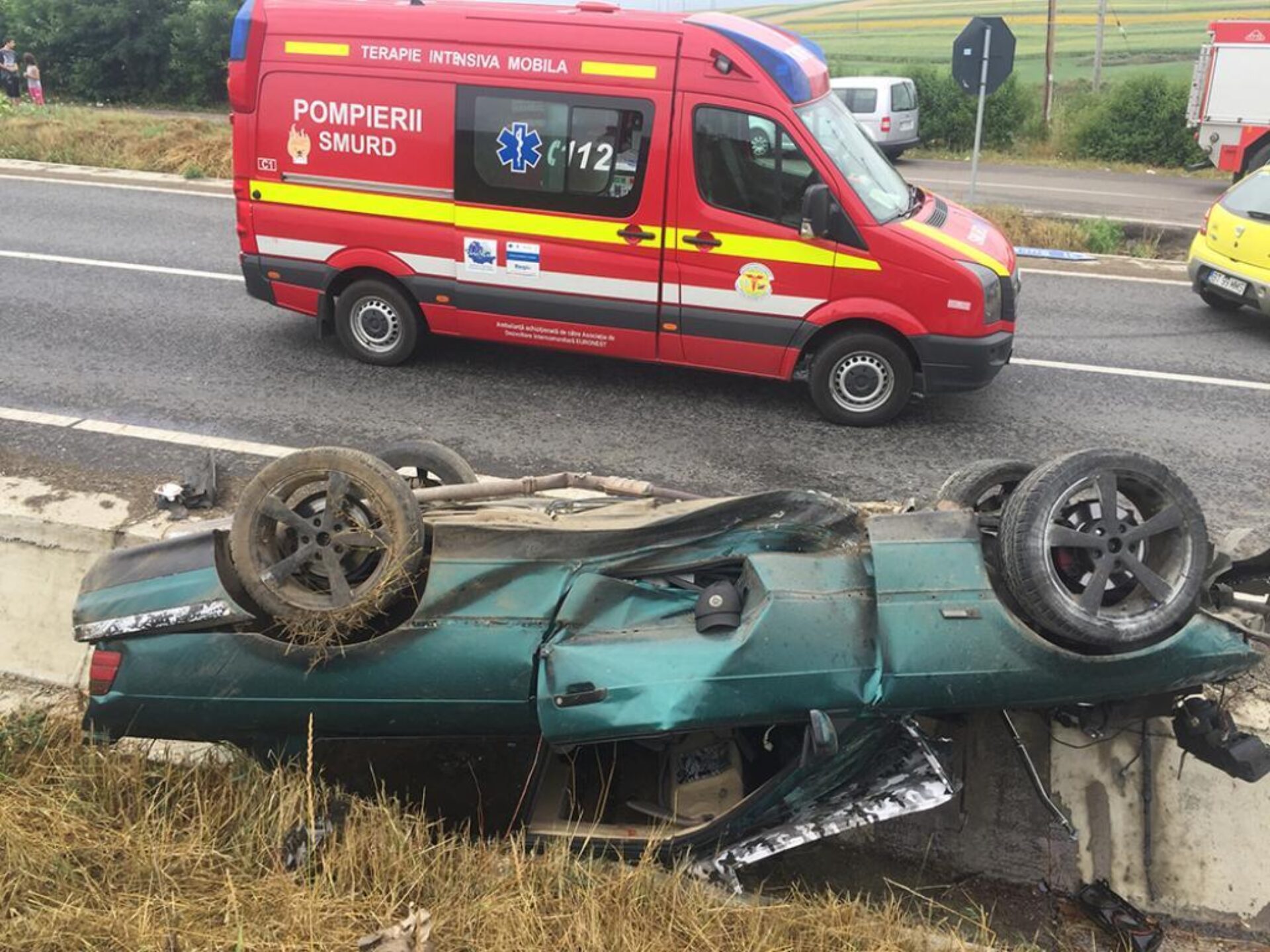 Mai mulți șoferi care treceau prin zonă au sărit în ajutorul celor două persoane aflate în mașină, sunând imediat la 112. În scurt timp, la fața locului au ajuns echipajul SMURD, o ambulanță, polițiști, dar și o autospecială a ISU, pe carosabil fiind scurgeri de carburanți.