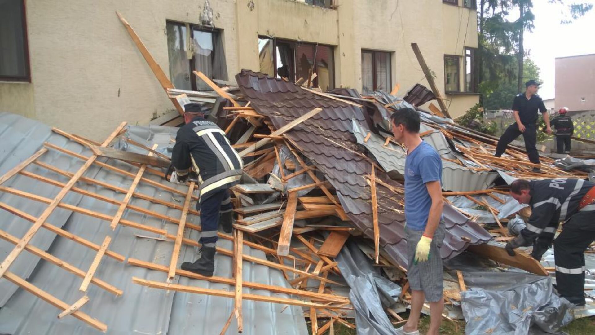 Militarii Detașamentului de Pompieri Rădăuți au intervenit duminică după-amiază cu cinci autospeciale pe str. Putnei din municipiul Rădăuți după ce vântul puternic a smuls acoperișul internatului Colegiului „Andronic Motrescu”. La fața locului s-a deplasat și Grupa Operativă a Inspectoratului pentru Situații de Urgență, iar conducerea intervenției a fost preluată de inspectorul-șef, generalul de brigadă Ion Burlui.La sosirea echipajelor (20 de militari), acoperișul clădirii internatului Colegiului „Andronic Motrescu”, cu o suprafață de 15×45 metri (aproximativ 675 metri pătrați), a fost smuls în totalitate de vântul puternic.O parte din acesta a căzut peste o clădire destinată practicii elevilor, unde a afectat aproximativ 50 de metri pătrați din acoperișul cu învelitoare din țiglă.Cealaltă parte de acoperiș, de aproximativ 90 de metri pătrați, a fost purtată de vânt și a trecut peste șosea (str. Putnei), lovind violent un bloc de locuințe, aflat la aproximativ 100 de metri distanță. A fost afectată fațada blocului pe o suprafață de aproximativ 80 de metri pătrați. De asemenea, s-au spart trei geamuri și s-au degradat doi metri liniari de astereală și acoperiș.Pompierii militari au asigurat zona pentru a preveni producerea unor eventuale accidente și au lucrat pentru îndepărtarea elementelor de construcție distruse de vântul puternic.Duminică seară, misiunea salvatorilor este în desfășurare.