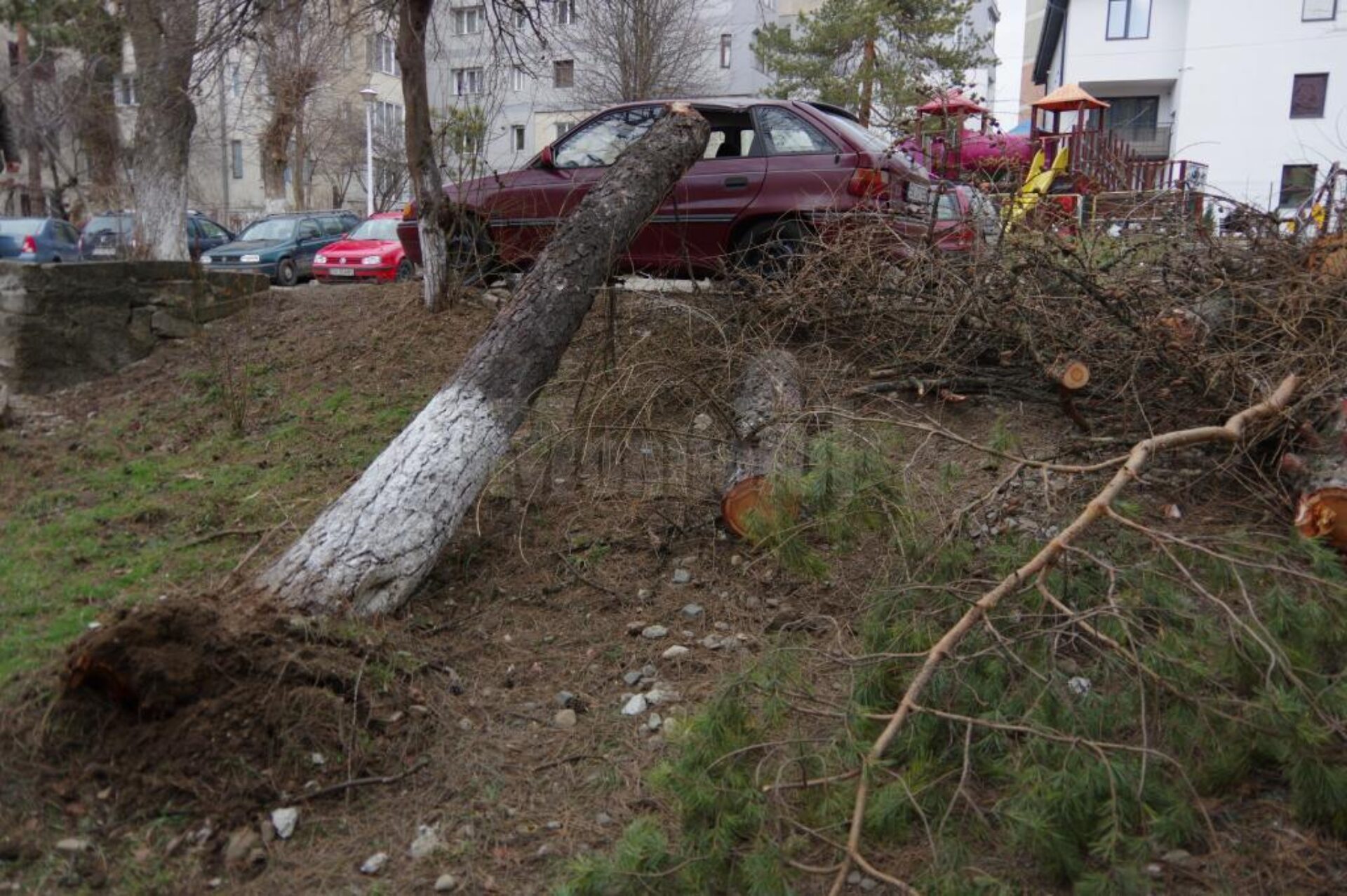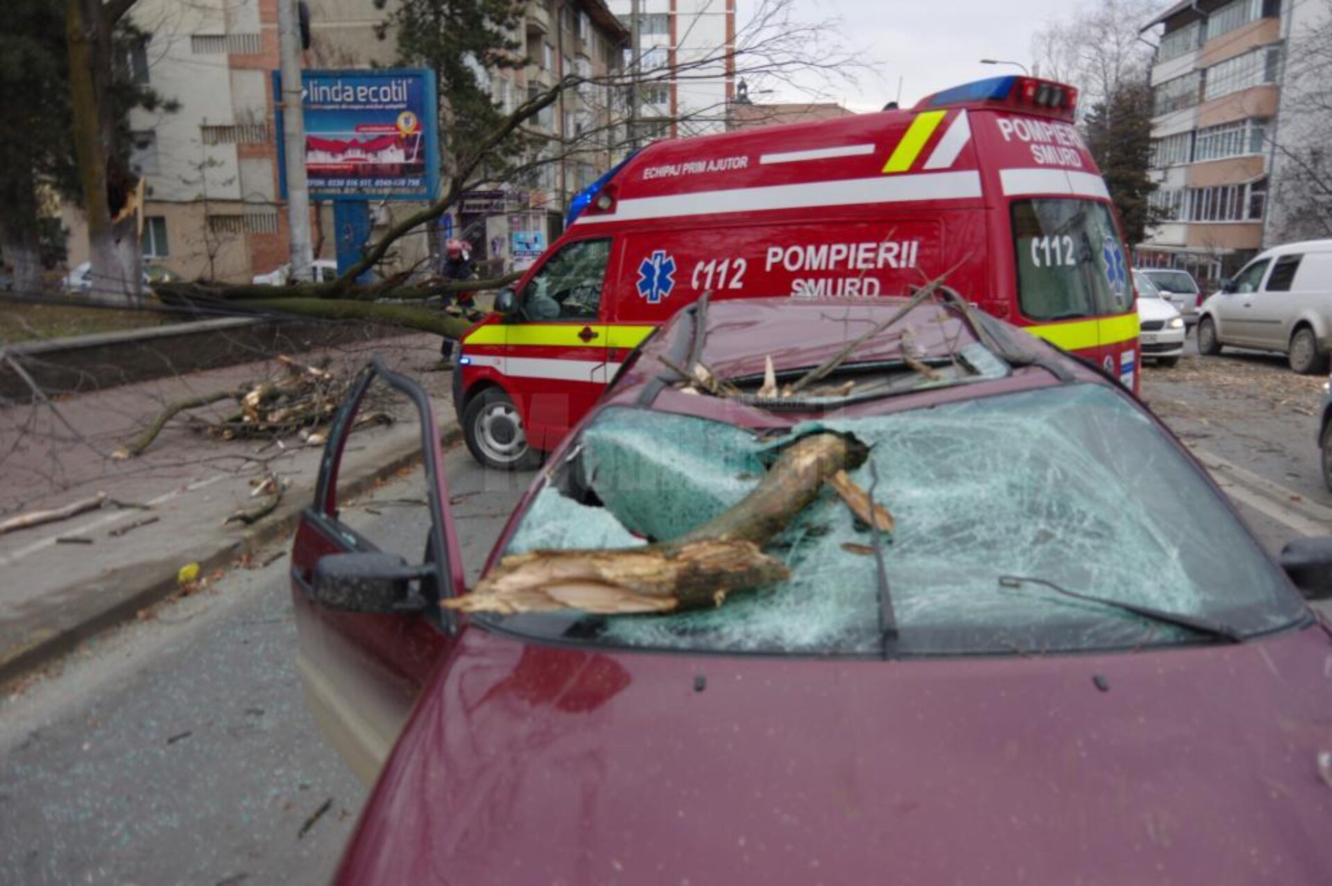 În timpul vijeliei un copac a fost smuls din rădăcini și s-a prăbușit peste o mașină parcată pe strada Oituz din oraș. Copacul a distrus cupola autoturismului Opel, iar pompierii au acționat cu drujbe pentru îndepărtarea acestuia.